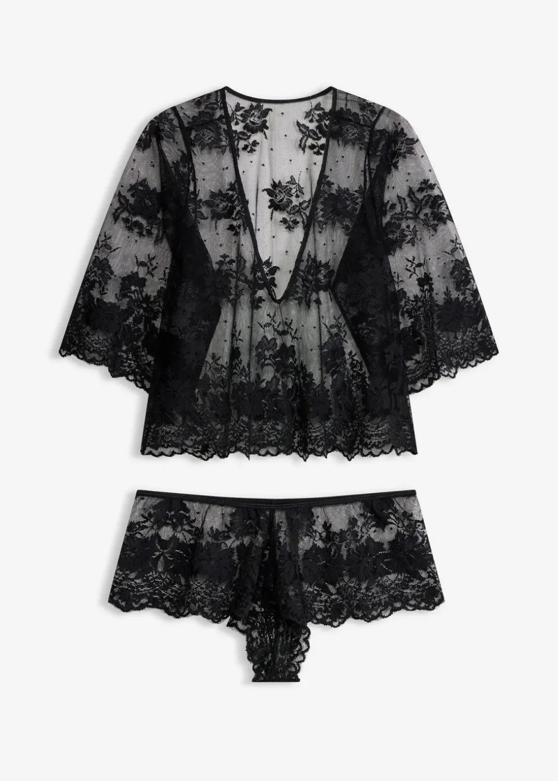 Dieses erotische Set aus Langarmtop und Panty verzaubert mit transparenter Spitze. Die elastische Spitze schmiegt sich komfortabel an die Haus an und der tiefe V-Ausschnitt macht Ihr Dekolleté zu einem hübschen Hingucker. Die starke Transparenz der Spitze lässt Ihre Rundungen verführerisch durchschimmern und die eng anliegende Panty verziert Ihren Po elegant. Das Set ist auch in großen Größen erhältlich.