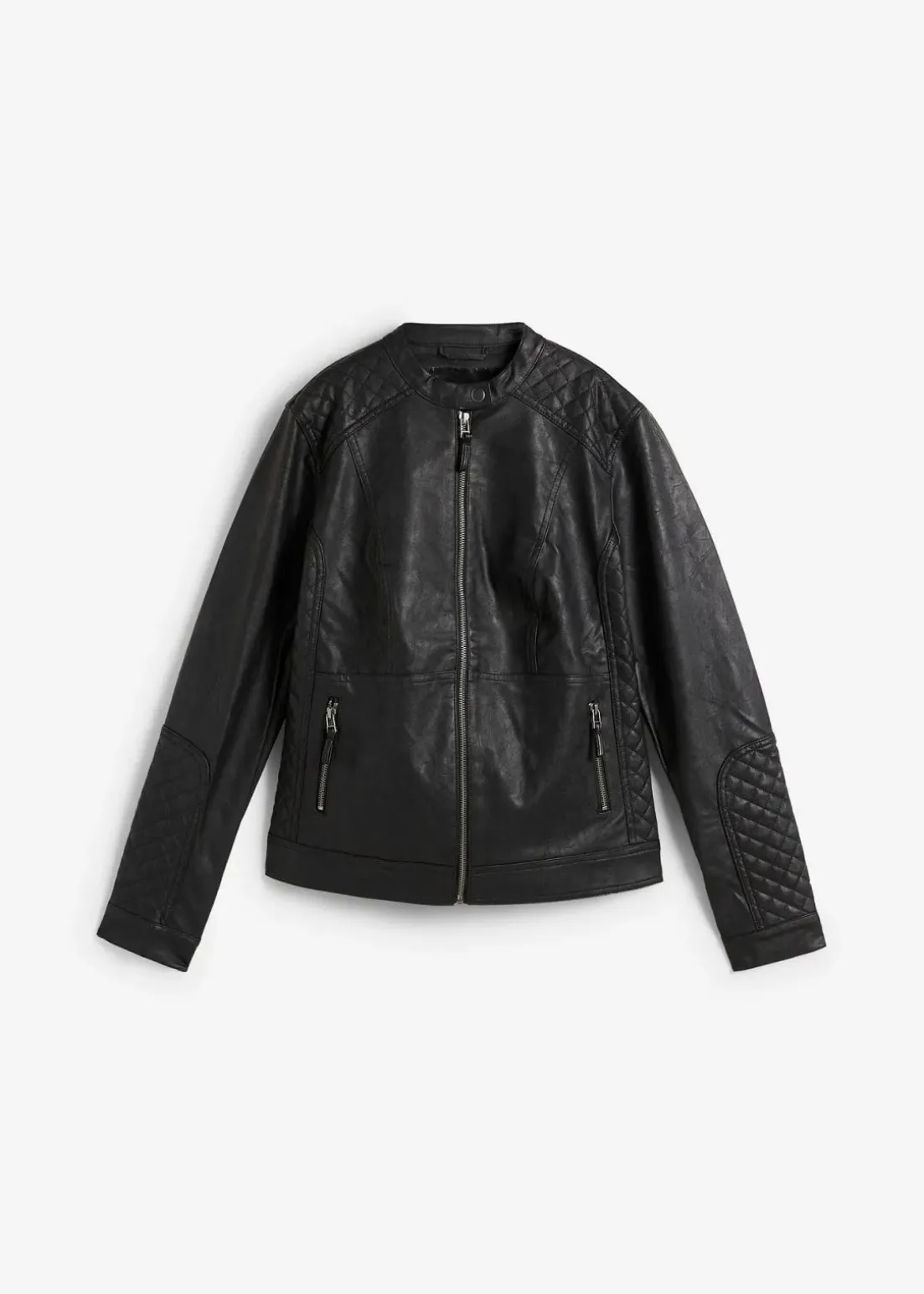 Mit dieser Jacke von bpc erhält Ihr Outfit eine legere Note. Sie ist aus schönem Kunstleder und zeichnet sich durch gesteppte Details an Schultern und Seiten aus. Vorne ist sie mit diversen Ziernähten und zwei Reißverschlusstaschen geschmückt.Die Lederimitat-Jacke hat einen Druckknopf am Ärmelende und einen kleinen Stehkragen mit Druckknopf. Die Übergangsjacke lässt sich per Reißverschluss schließen.