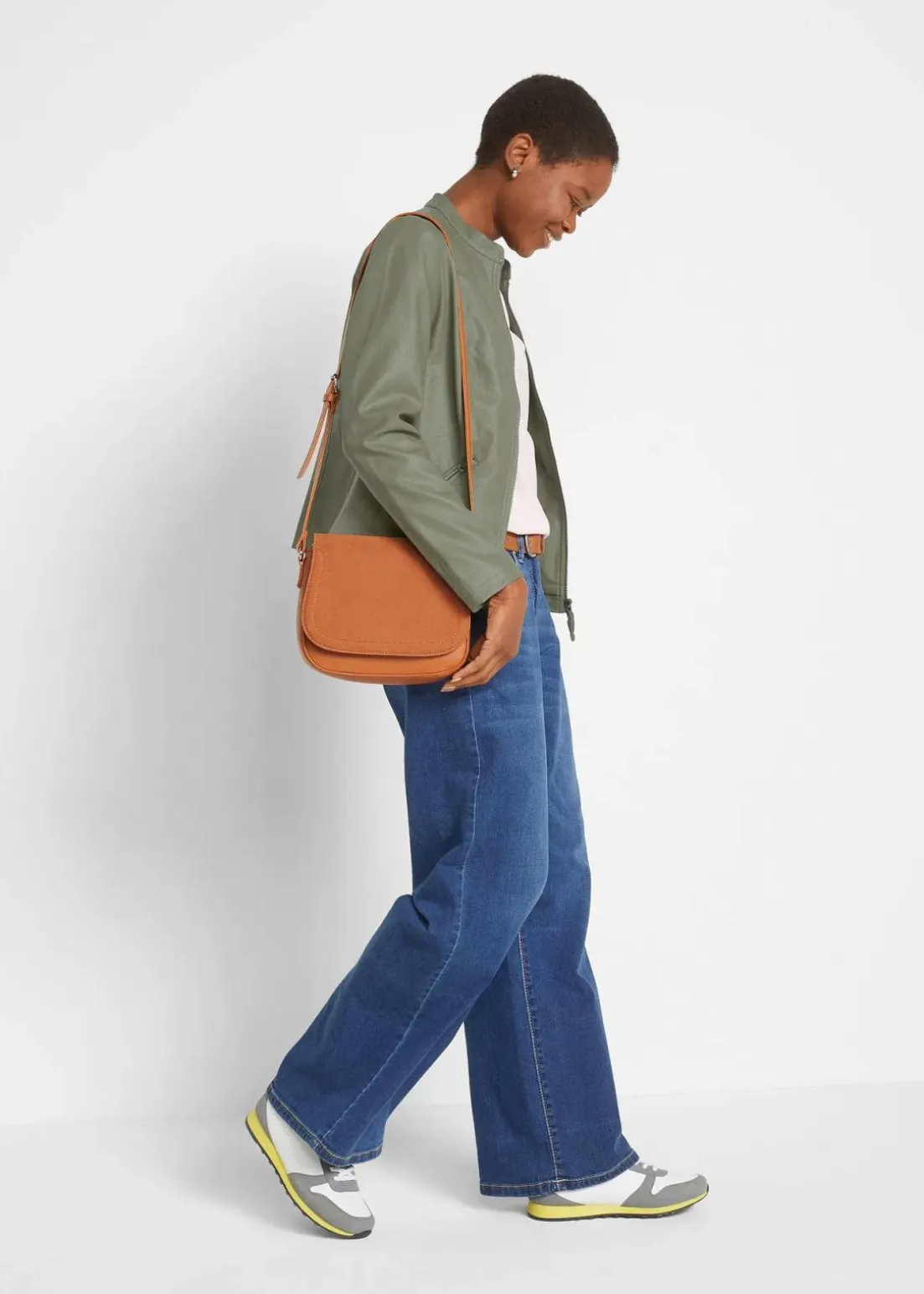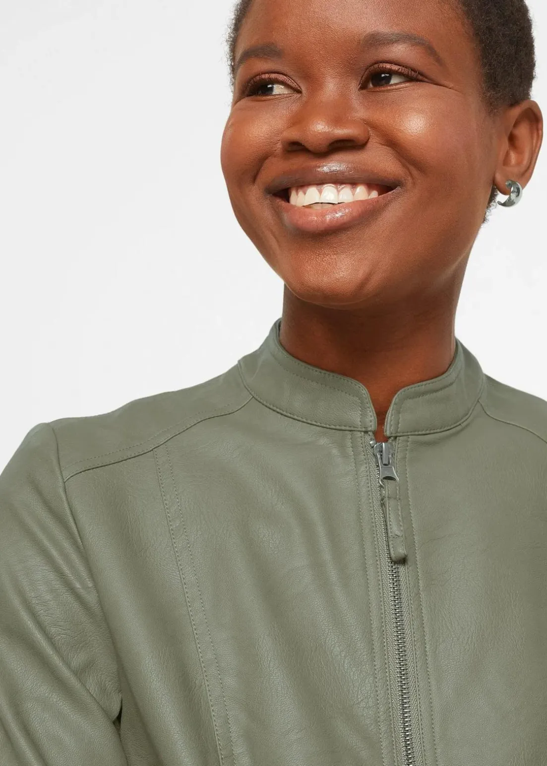 Diese ansprechende Lederimitat-Jacke aus der bpc Kollektion präsentiert sich mit feinen Details. Dazu gehören der kleine Stehkragen sowie zwei seitlich angesetzte Reißverschluss-Taschen auf der Vorderseite. Rippeinsätze an der Seite sowie an den Ärmeln sorgen für eine gute Passform und ein komfortables Tragegefühl. Die leicht taillierte Lederimitat-Jacke ist der ideale Begleiter zu Jeans und Stiefeletten, ergänzt aber auch schmal geschnittene Midi-Röcke mit Pumps.
