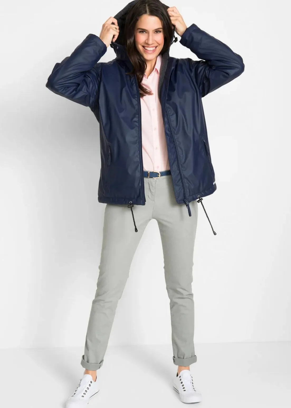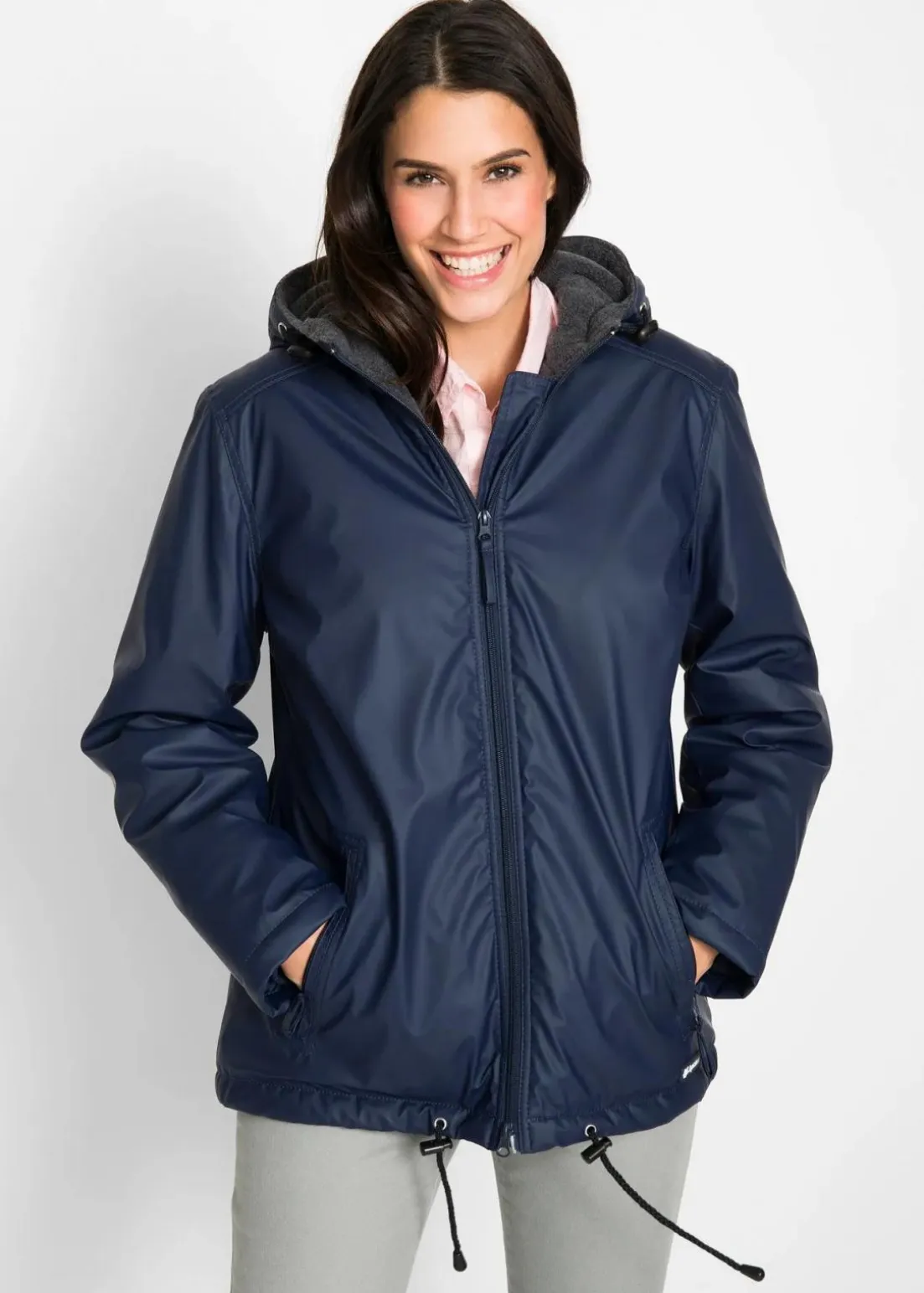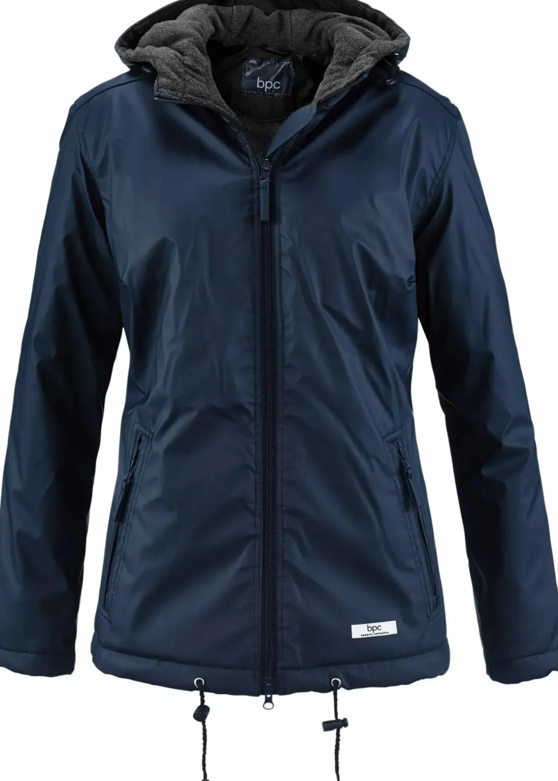 Dank des leicht gummierten Materials schützt diese Übergangsjacke zuverlässig vor Regen und Kälte. Das Innenfutter aus angenehm weichem Fleece-Material sorgt für hohen Tragekomfort.Über den praktischen 2-Wege-Reißverschluss lässt sich die Übergangsjacke von bpc auch von unten öffnen. Mit den elastischen Stopper-Kordeln am Saum können Sie die Weite unkompliziert und schnell regulieren. Die große Kapuze unterstreicht die legere und sportive Optik der Jacke.