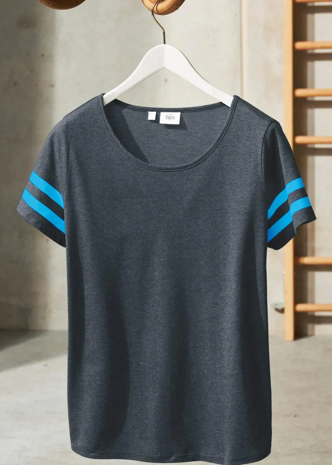 Sport-Shirt mit Streifen auf den Ärmeln, kurzarm, leicht ausgestellt, maschinenwaschbar, Länge in Gr. 40/42 ca. 70cm.