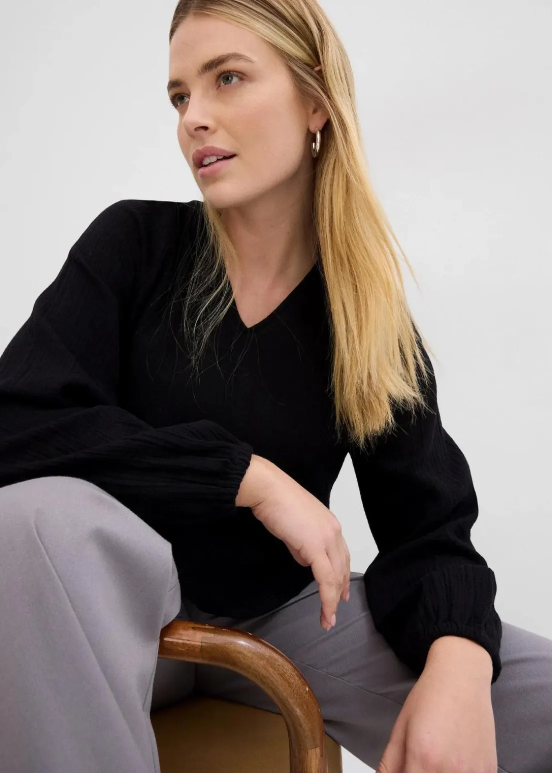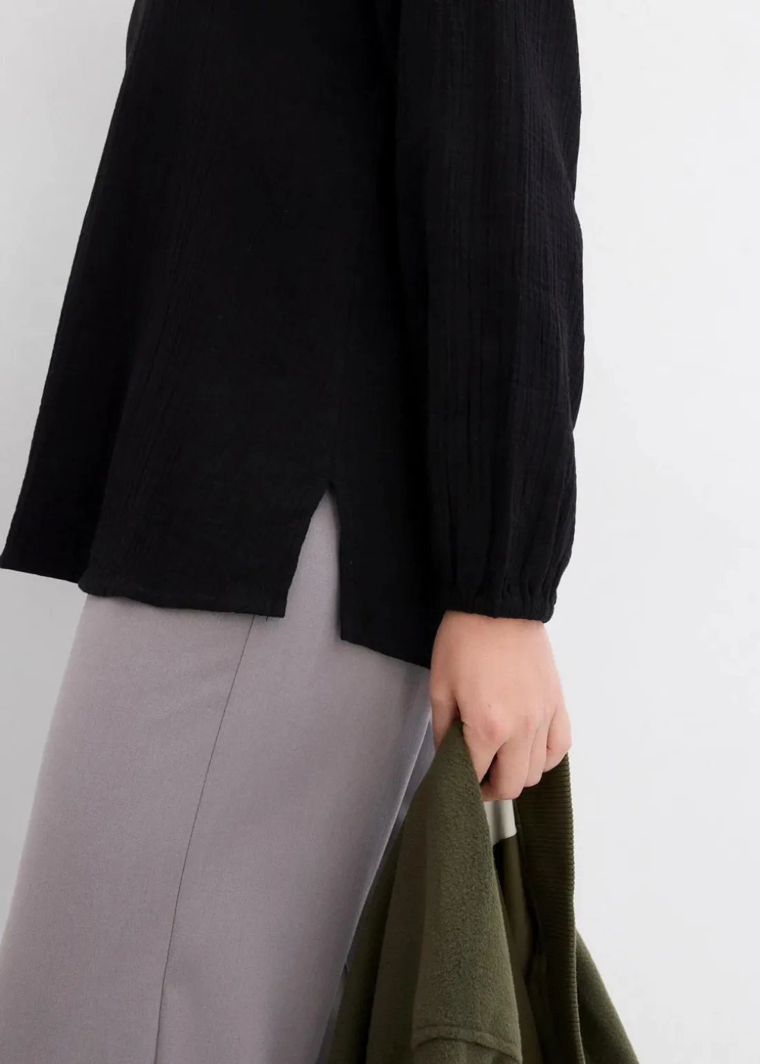 Locker geschnittene Bluse aus weichem Baumwollmusselin. Stehkragen mit Steppnähten und V-Ausschnitt.