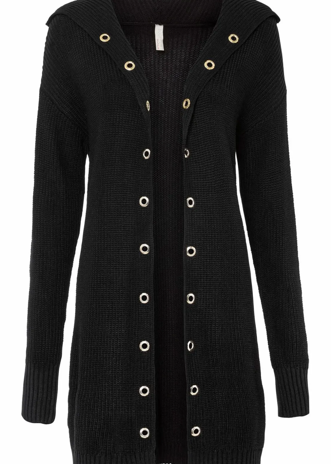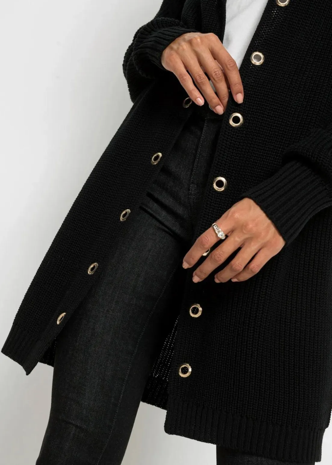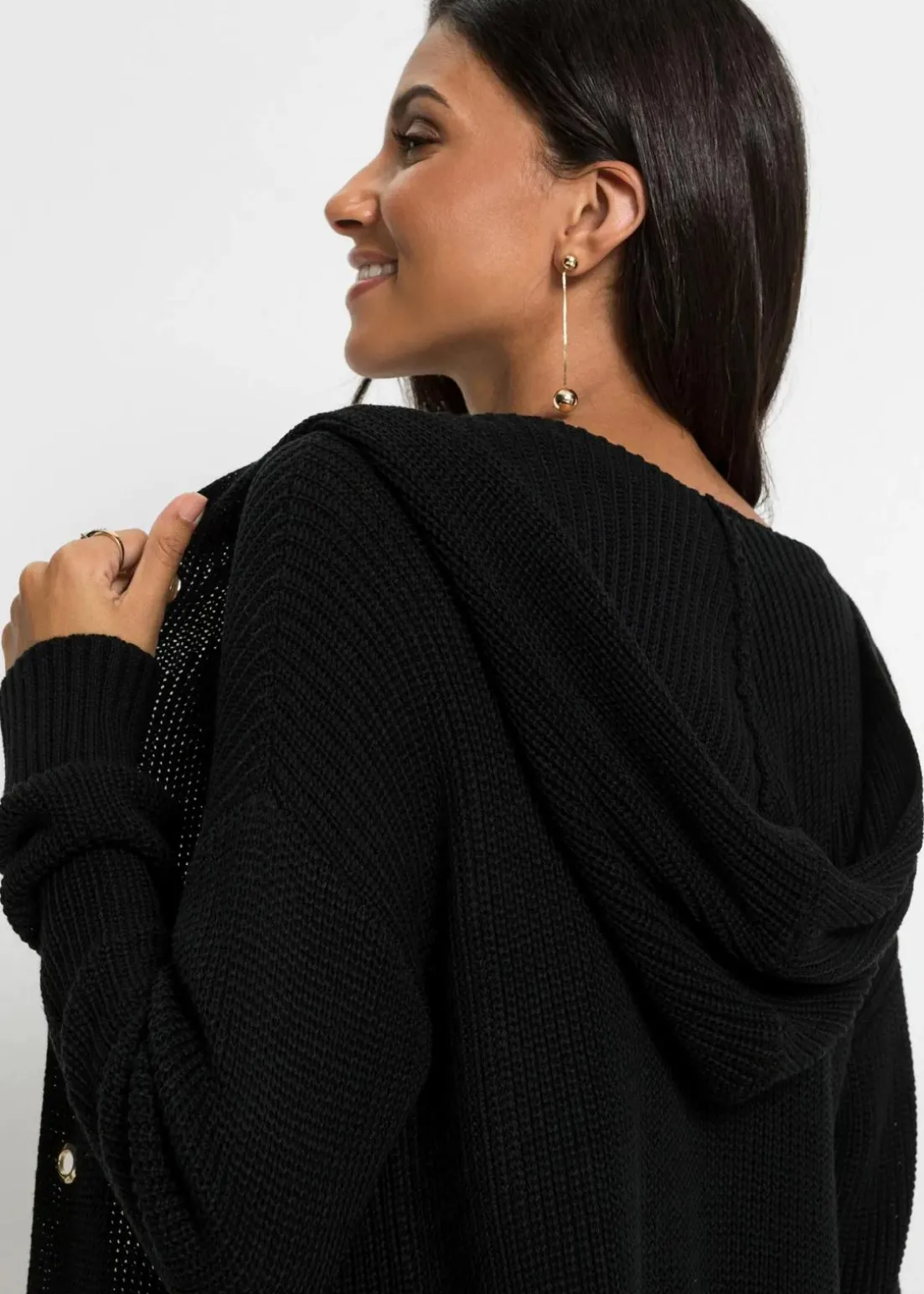 Die Longstrickjacke mit Kapuze lässt sich vielseitig zu entspannten Freizeitoutfits kombinieren.