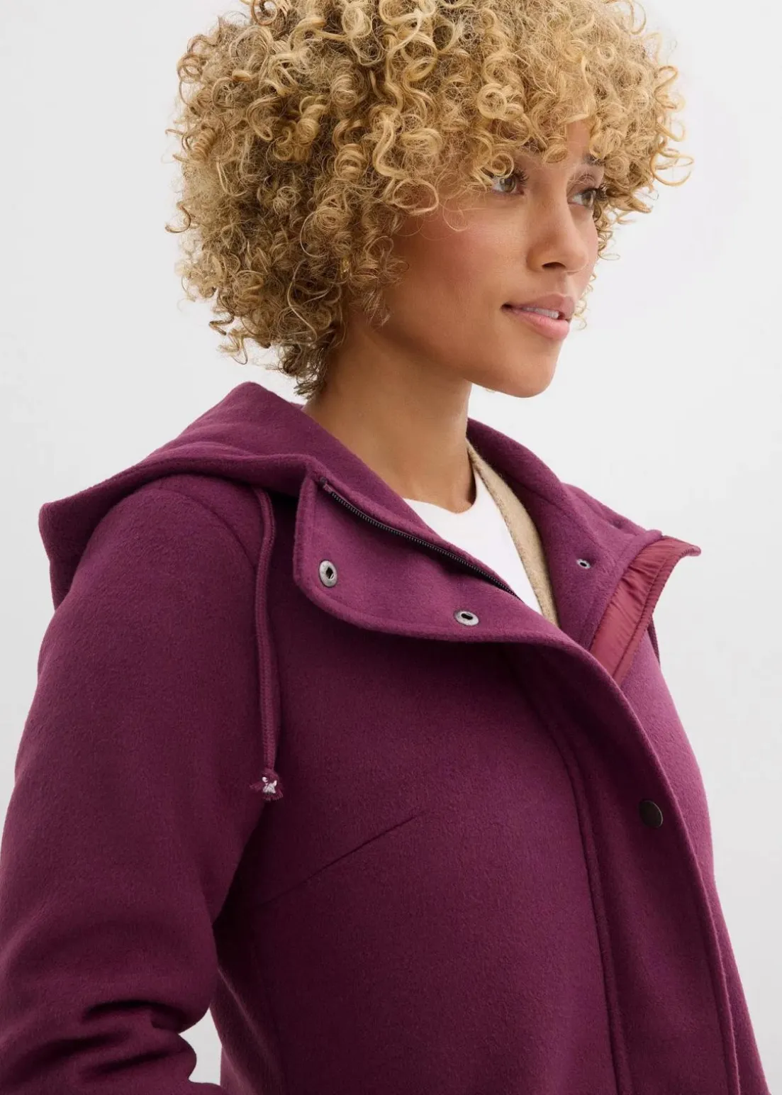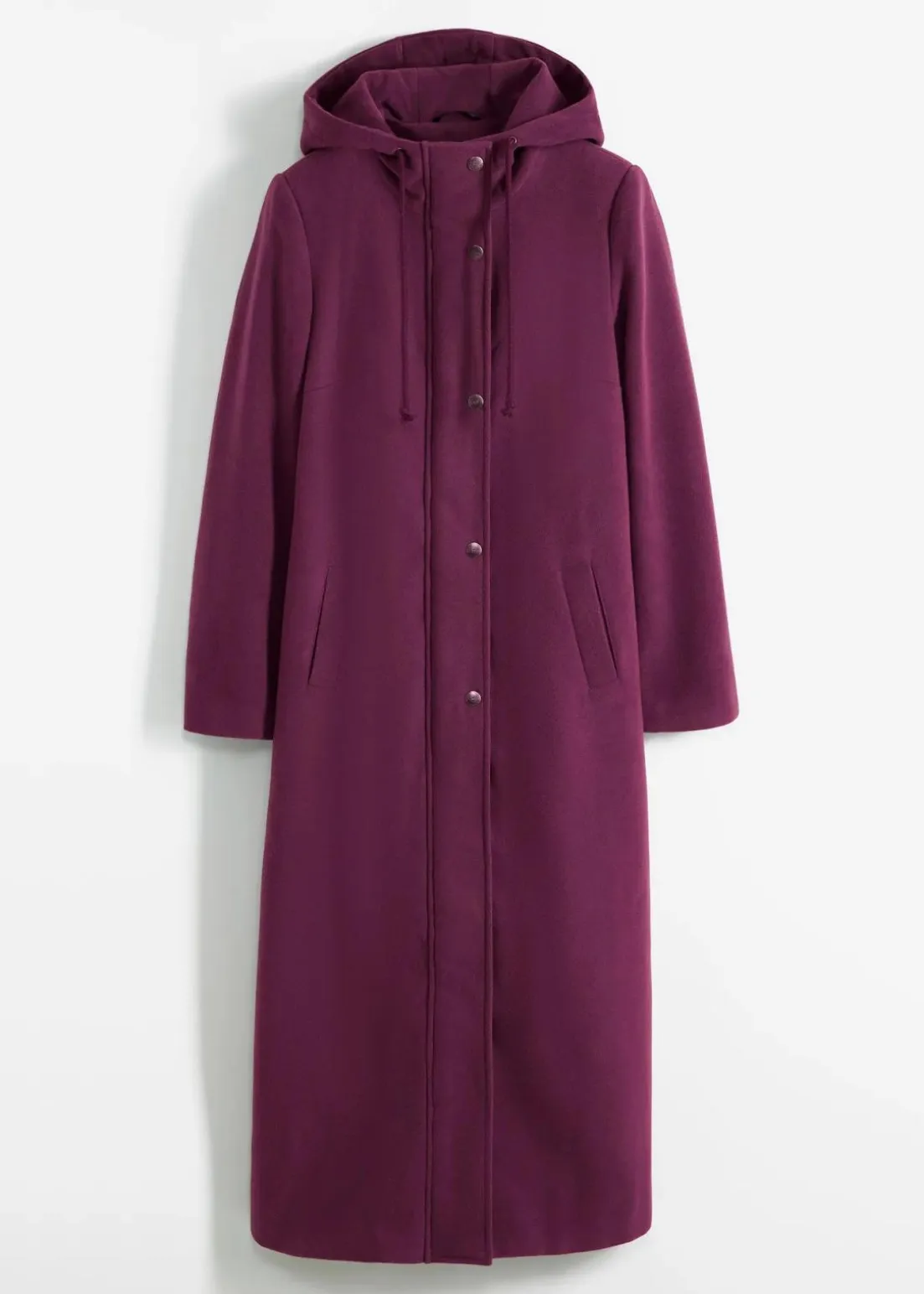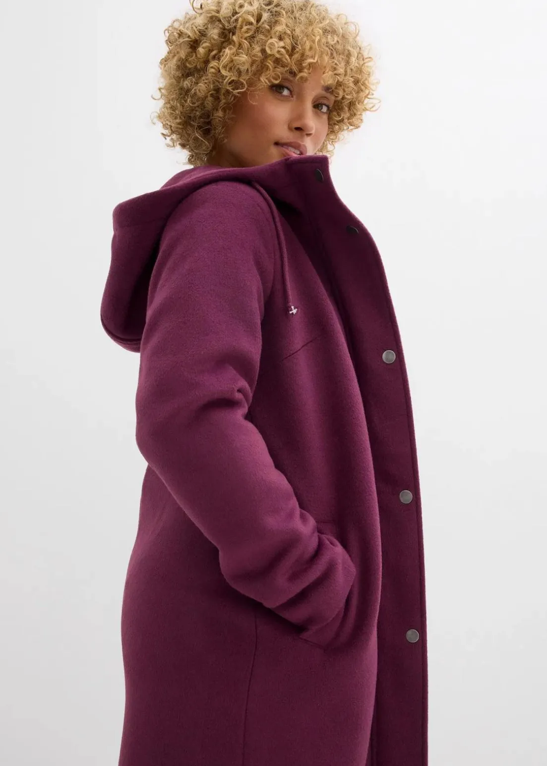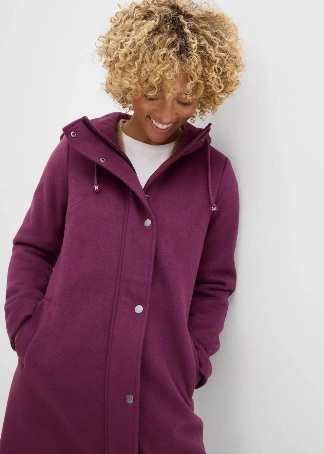 Lässiger Longmantel in Wolloptik mit Kapuze und Kordelzug, seitliche Eingriffstaschen
