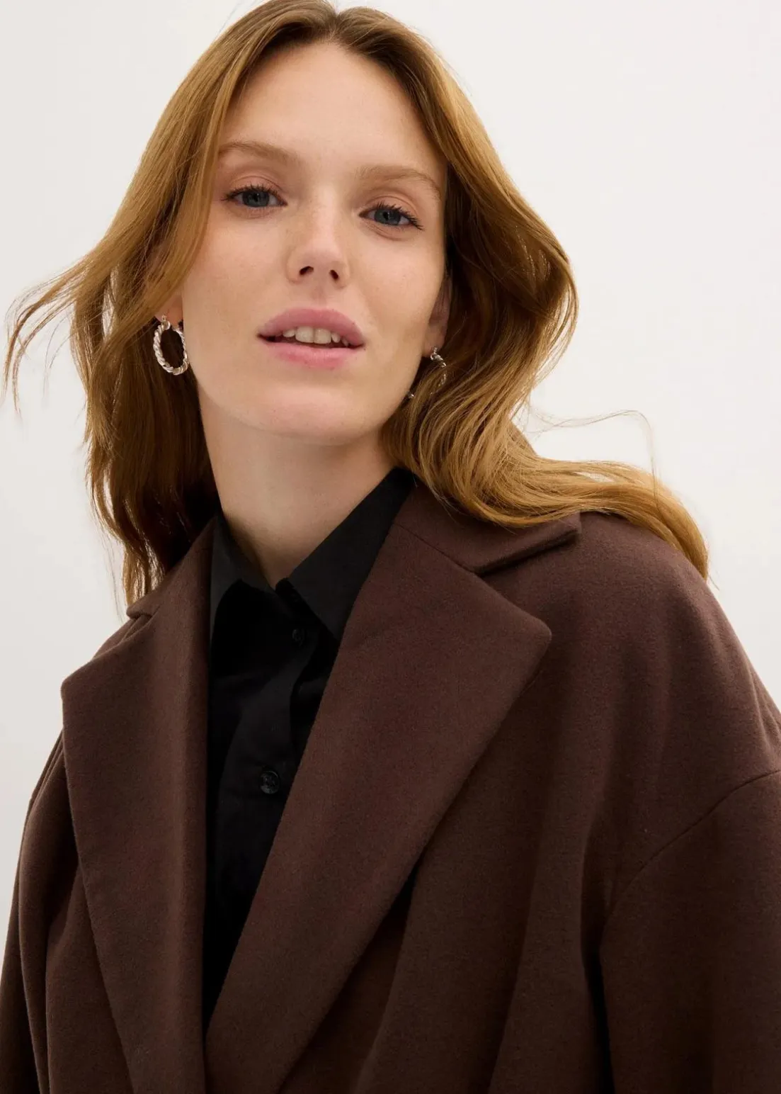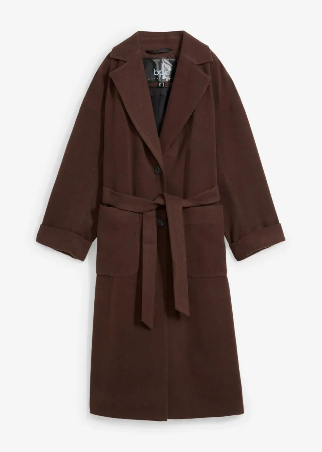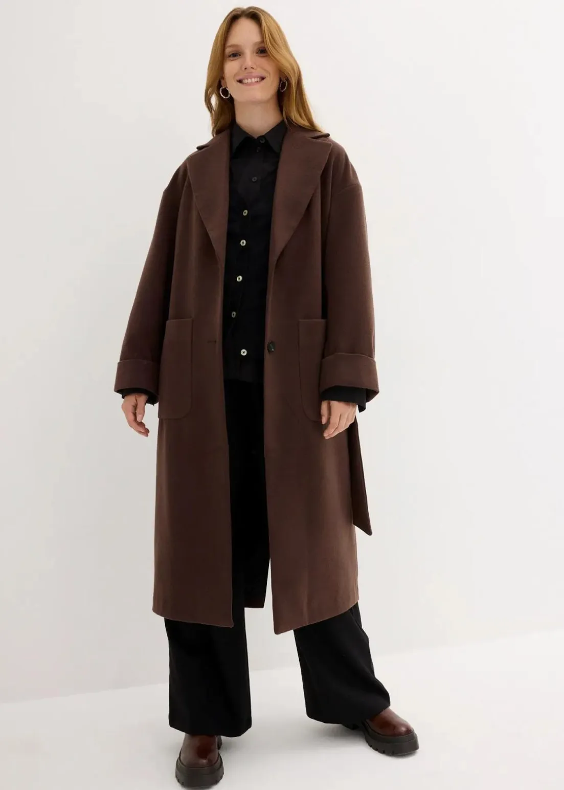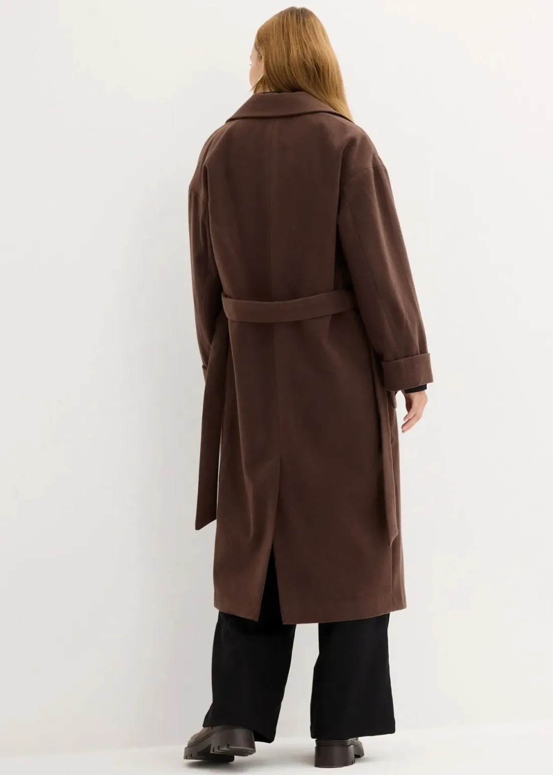 Moderner Wollimitat-Mantel mit Taschen und Bindegürtel
