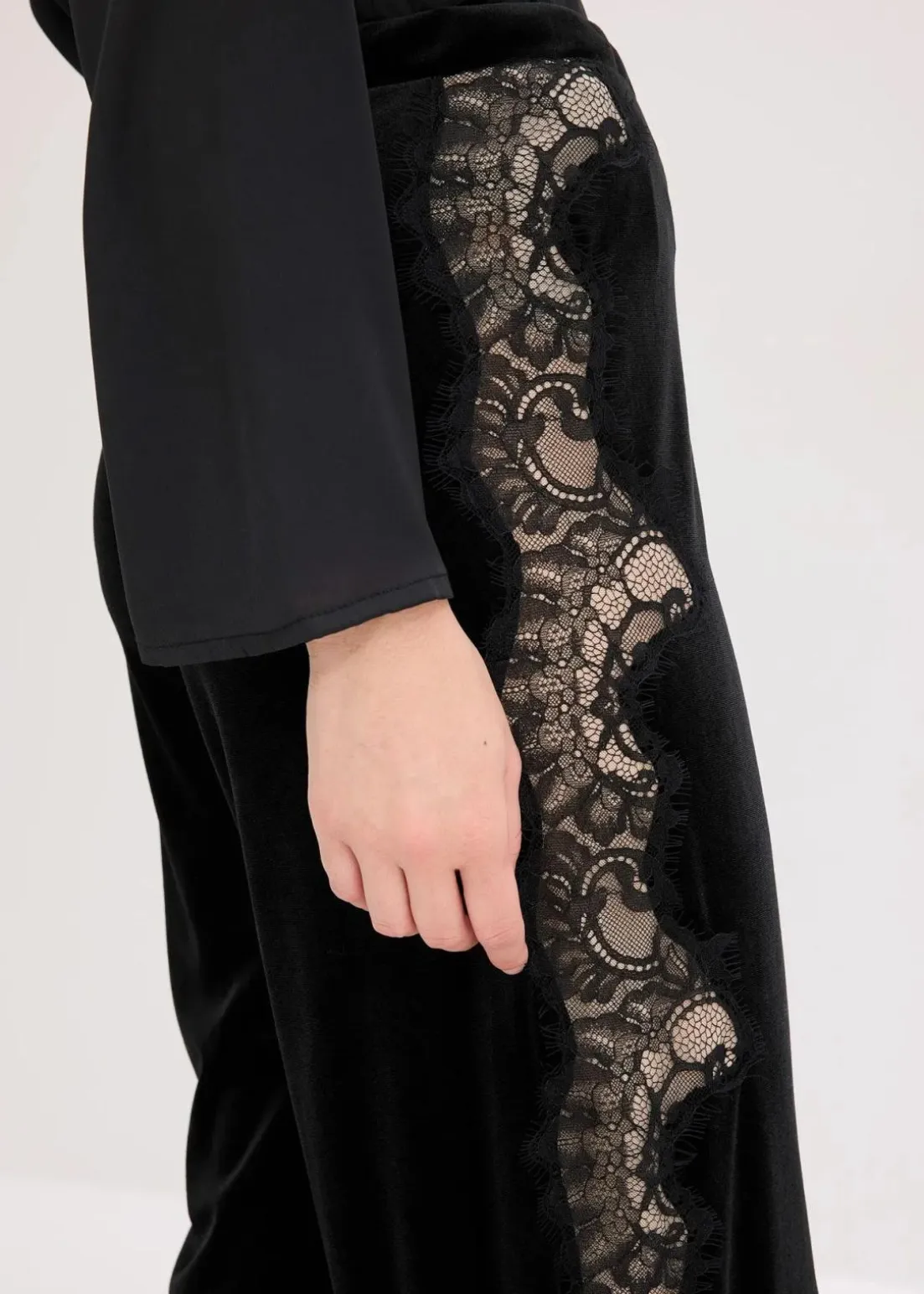 modische Marlenehose aus softem Samt mit dekorativem Spitzeneinsatz an der Seite. Die Spitze ist mit hautfarbenem Mesh unterlegt