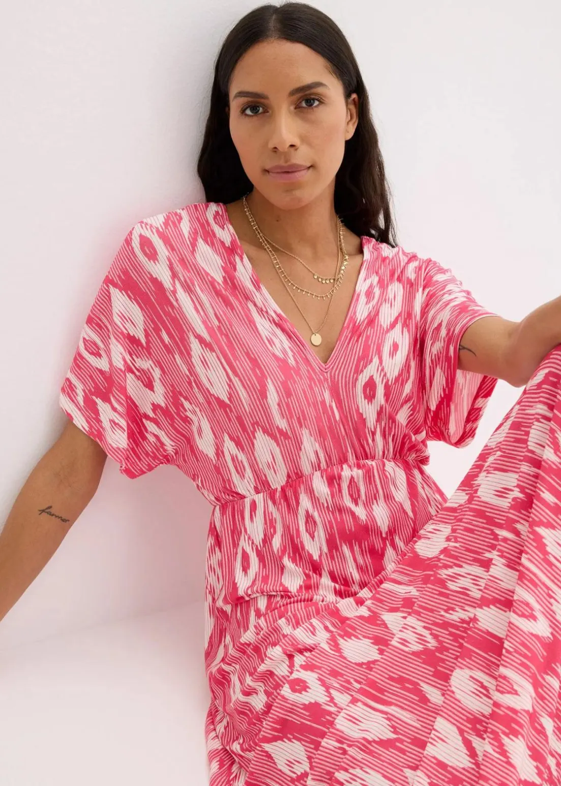 modisch bedrucktes Jerseykleid in Maxilänge mit weit geschnittenen Ärmeln und tiefem V-Ausschnitt vorne