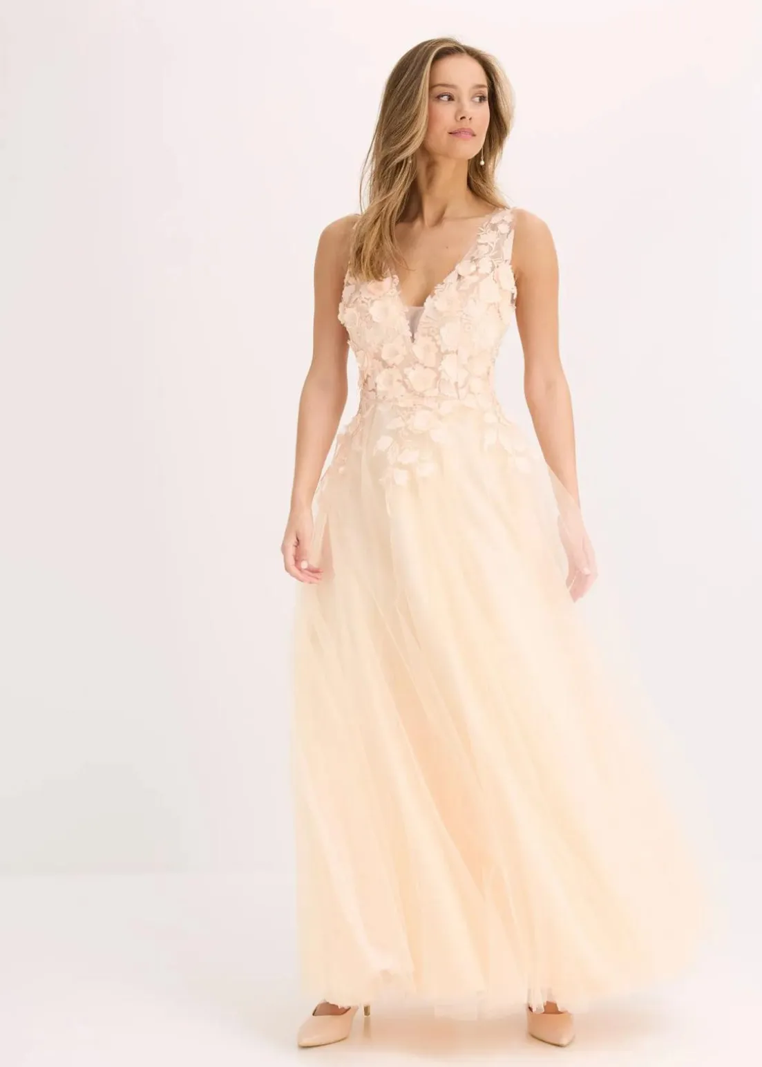 Romantisch und feminin: Bezauberndes Abendkleid in Maxi-Länge aus zartem Tüll mit Blumen-Applikation im Oberteil