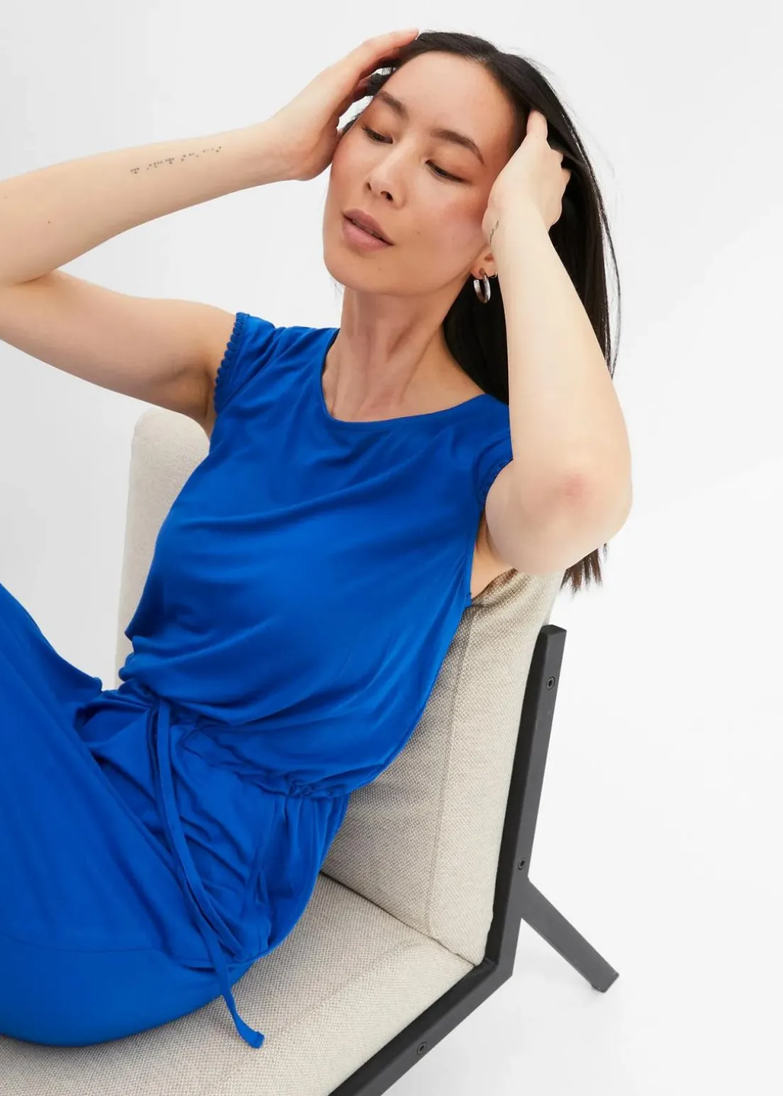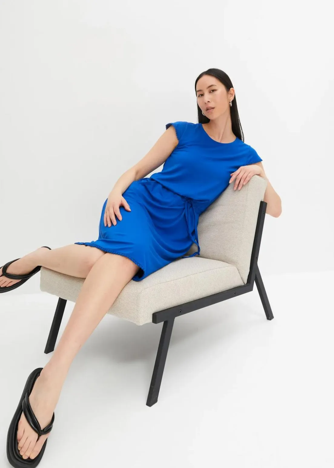 Tailliertes Midi-Jerseykleid, knieumspielend, mit Rundhalsausschnitt und kurzem Arm