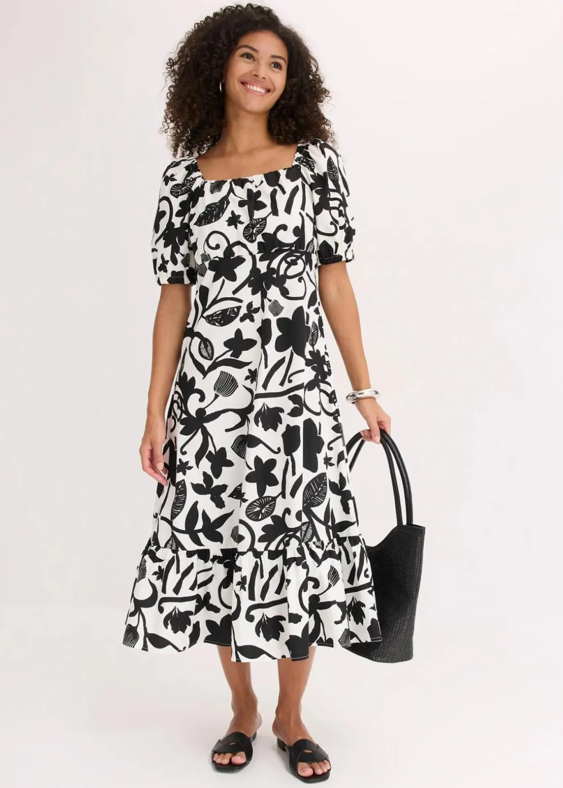 feminines Midikleid aus reiner Bio-Baumwolle mit Puffärmeln und gerafftem Oberteil