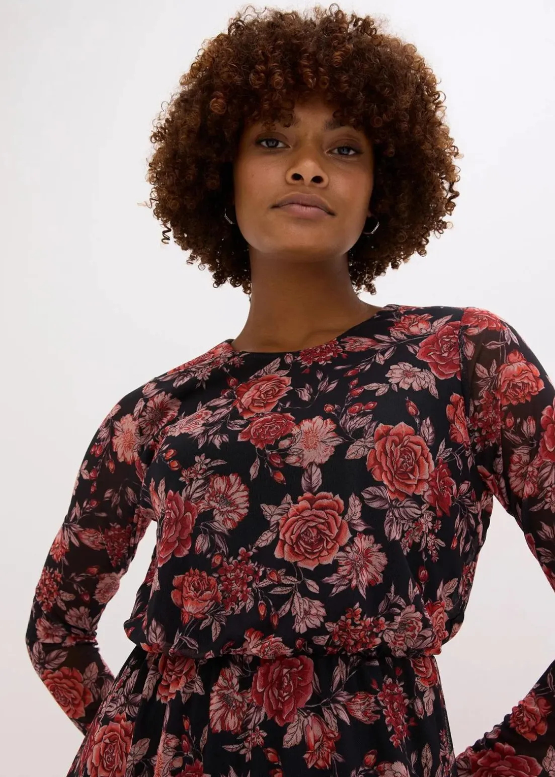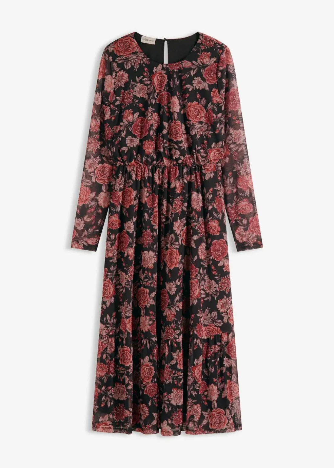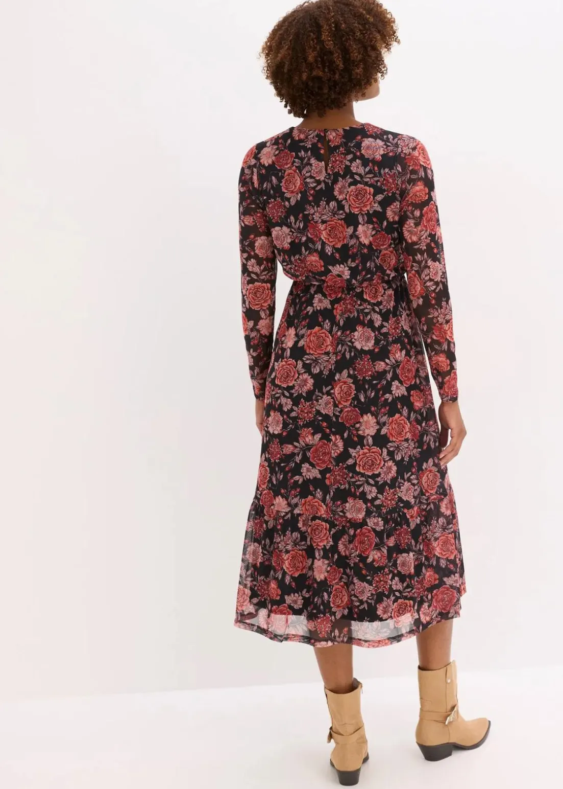 floral bedrucktes Jersey-Midikleid aus softem Mesh mit Volant am Saum