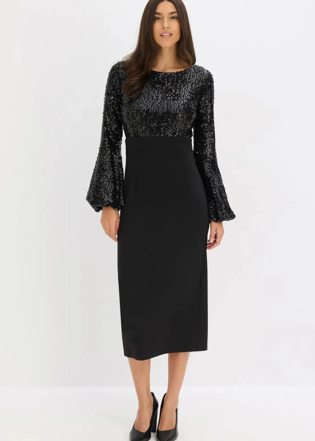 Modern und feminin: Midikleid mit Rock aus softem Scuba und einem Oberteil aus glänzenden Pailletten.