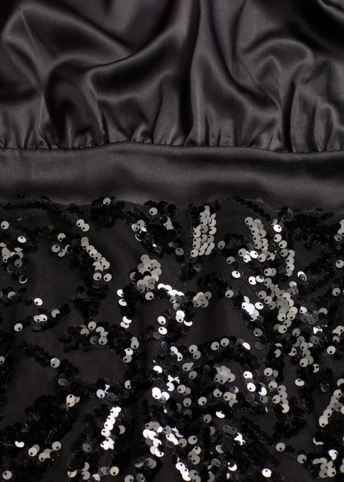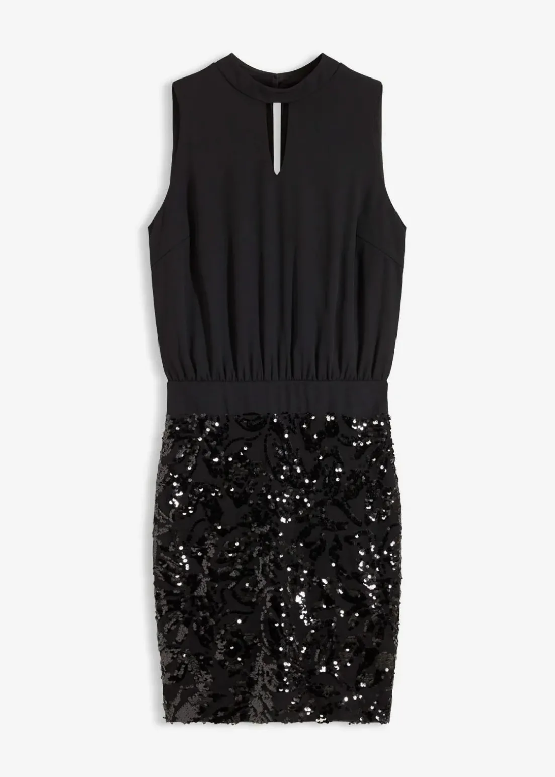 Modern und feminin: Minikleid mit Paillettenstickerei am Rock und glänzendem Oberteil.