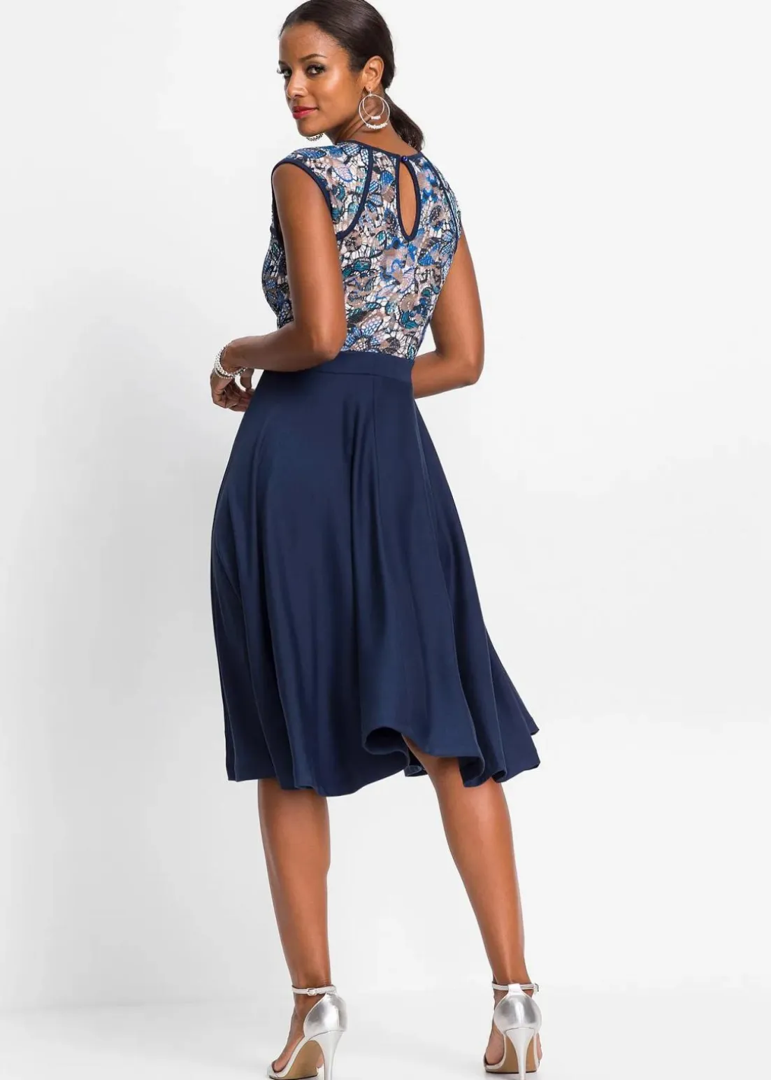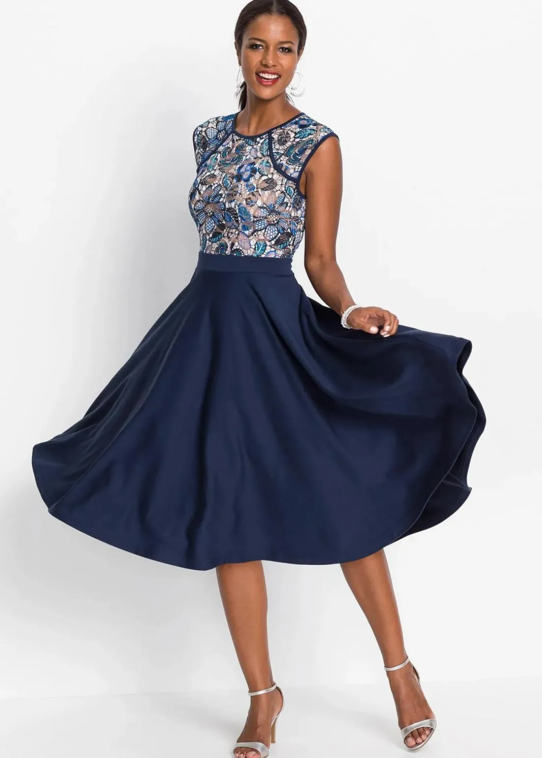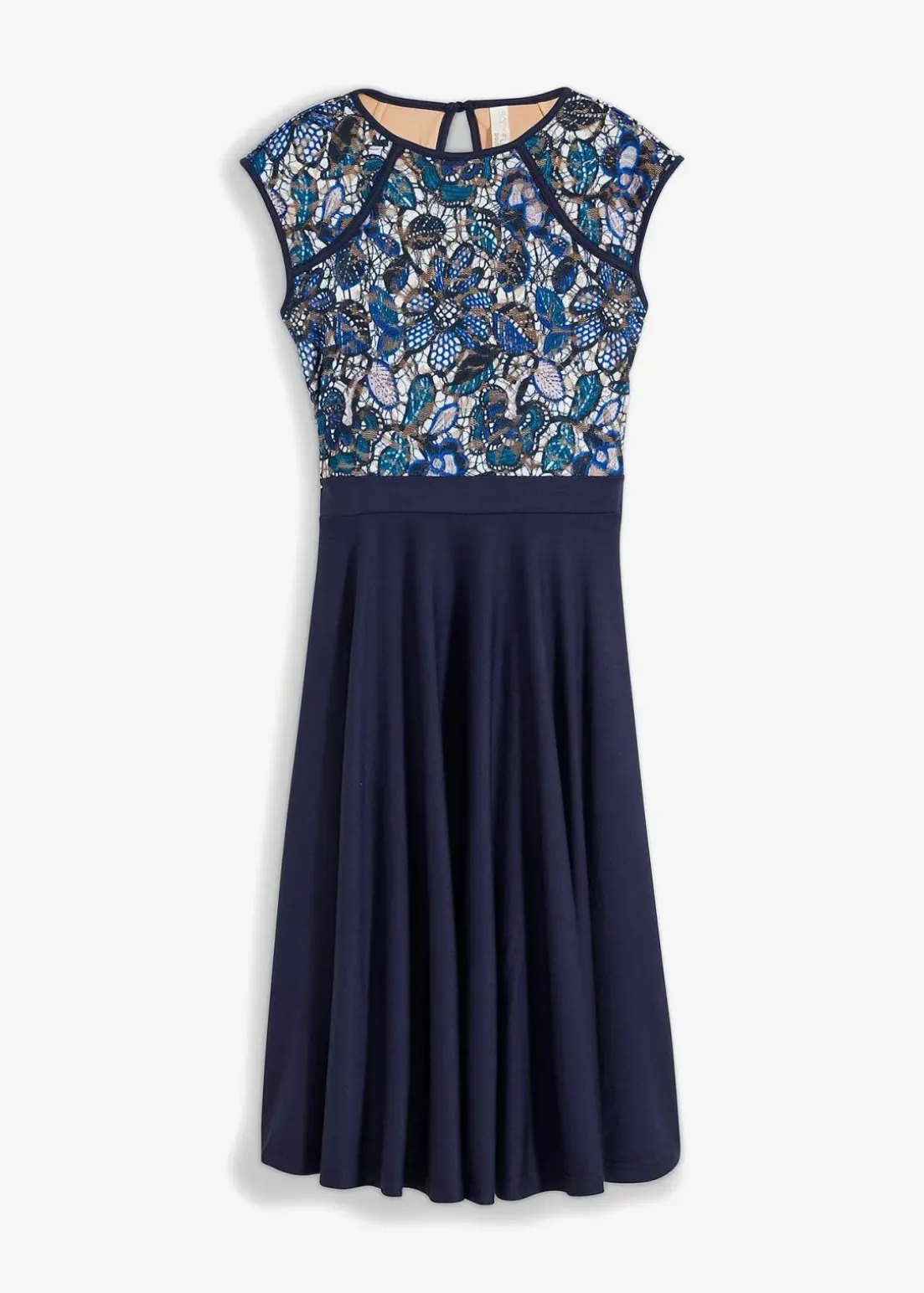 Romantisch und feminin: Midikleid mit Rock aus Punto di Roma Material und Spitze im Oberteil.