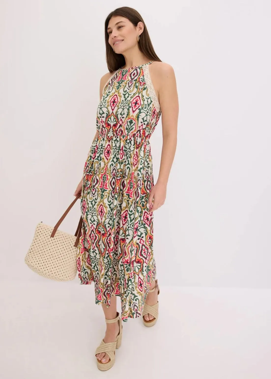 feminines Midikleid mit Spaghetti-Trägern und dekorativer Spitze entlang des Armlochs