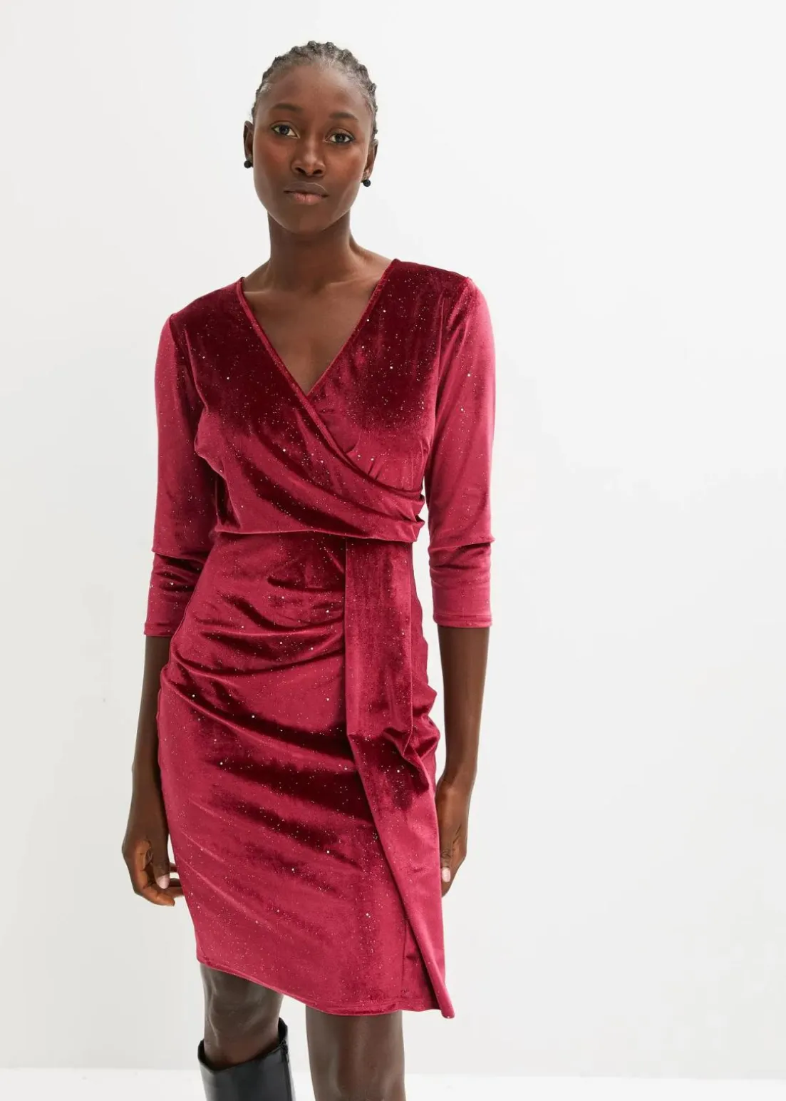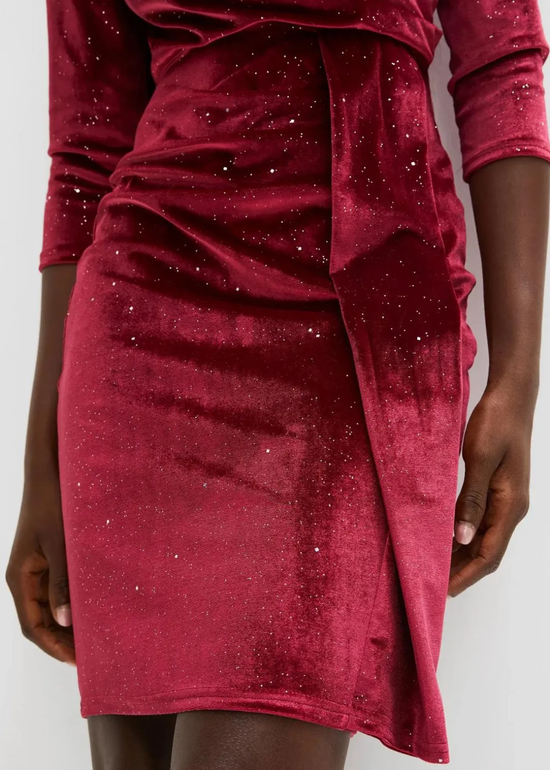 Modern und feminin: Samtkleid in Wickeloptik mit besetzten Strasssteinen und Raffungsdetails machen dieses Kleid perfekt für besondere Anlässe.