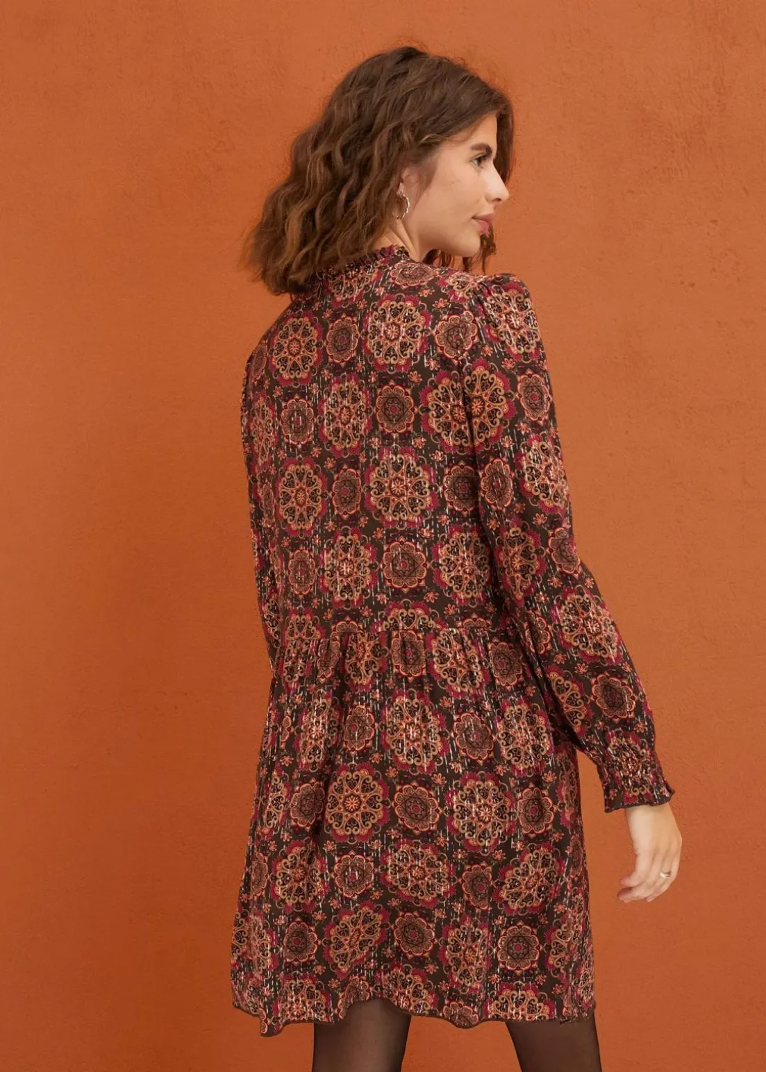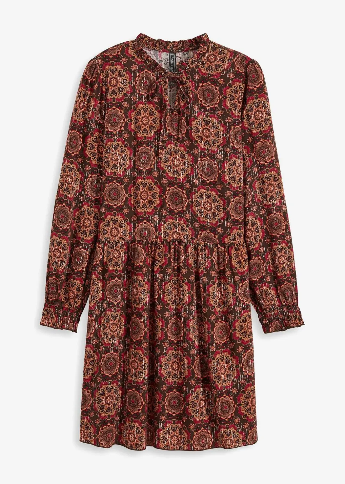 Kurzes bedrucktes Webkleid mit Rüschendetails und V-Ausschnitt