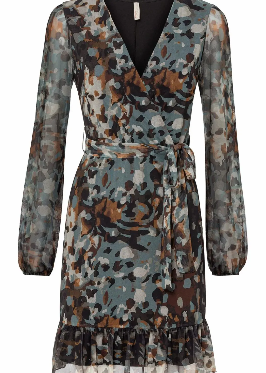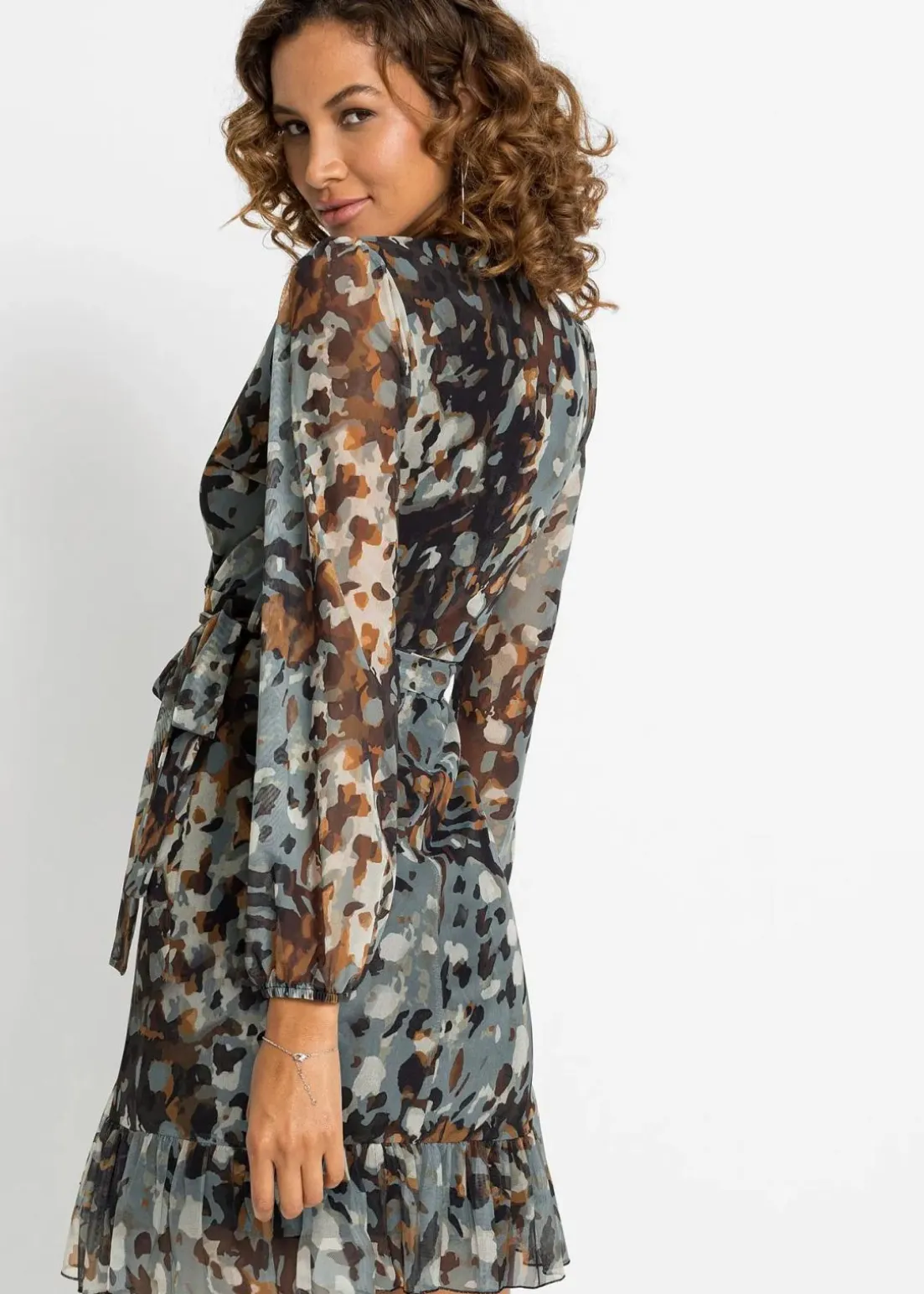 Modern und feminin: Minikleid aus luftigem Mesh mit Ballon-Ärmel und Volant