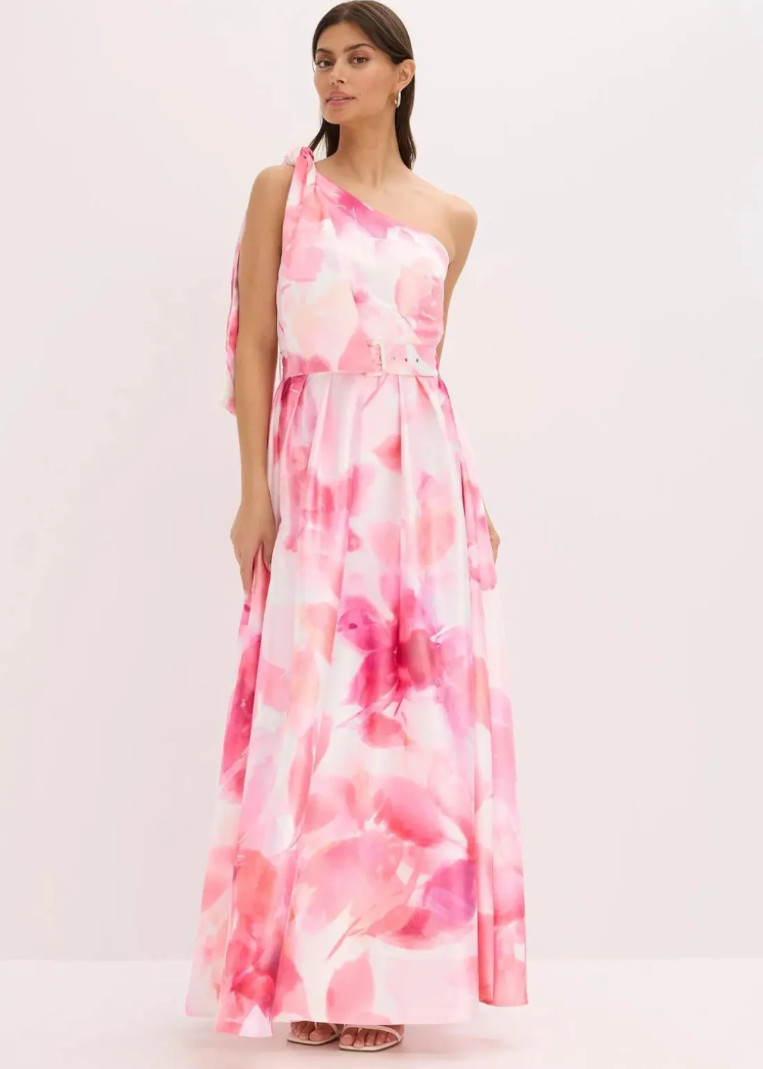 Modern und femin: One-Shoulder-Kleid in Maxi-Länge aus glänzendem Satin mit Allover-Print, womit es jedes Teil zu einem Unikat macht.