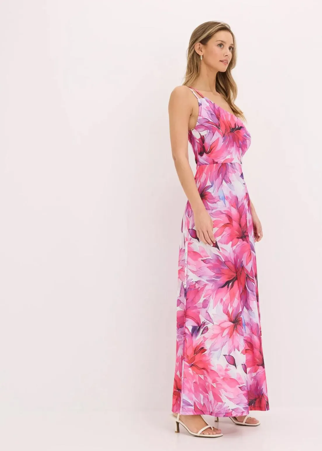 Modern und feminin: One-Shoulder-Kleid in Maxi-Länge aus strukturiertem Crepe mit einem Allover-Druck macht es jedes Teil zu einem Unikat