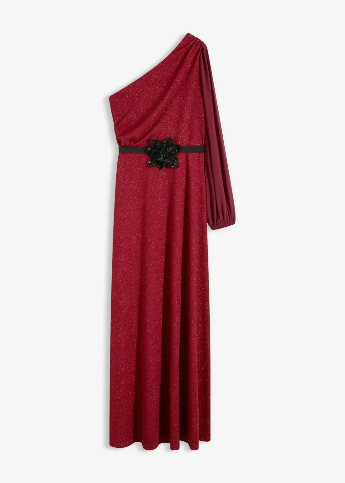 Glamourös und feminin: Abendkleid mit One-Shoulder-Ausschnitt und Glitzer in Maxi-Länge mit Blumen-Applikation an der Taille