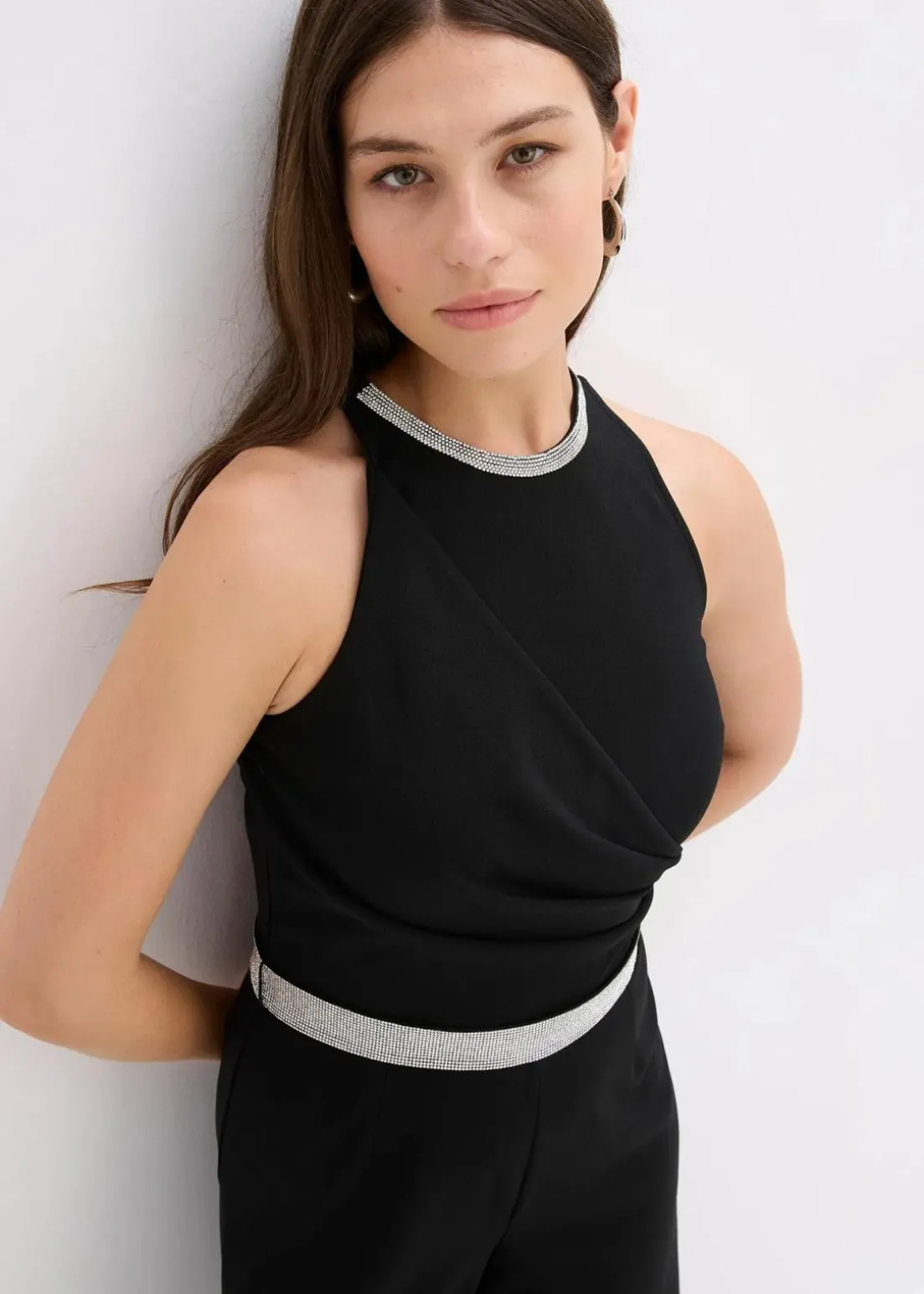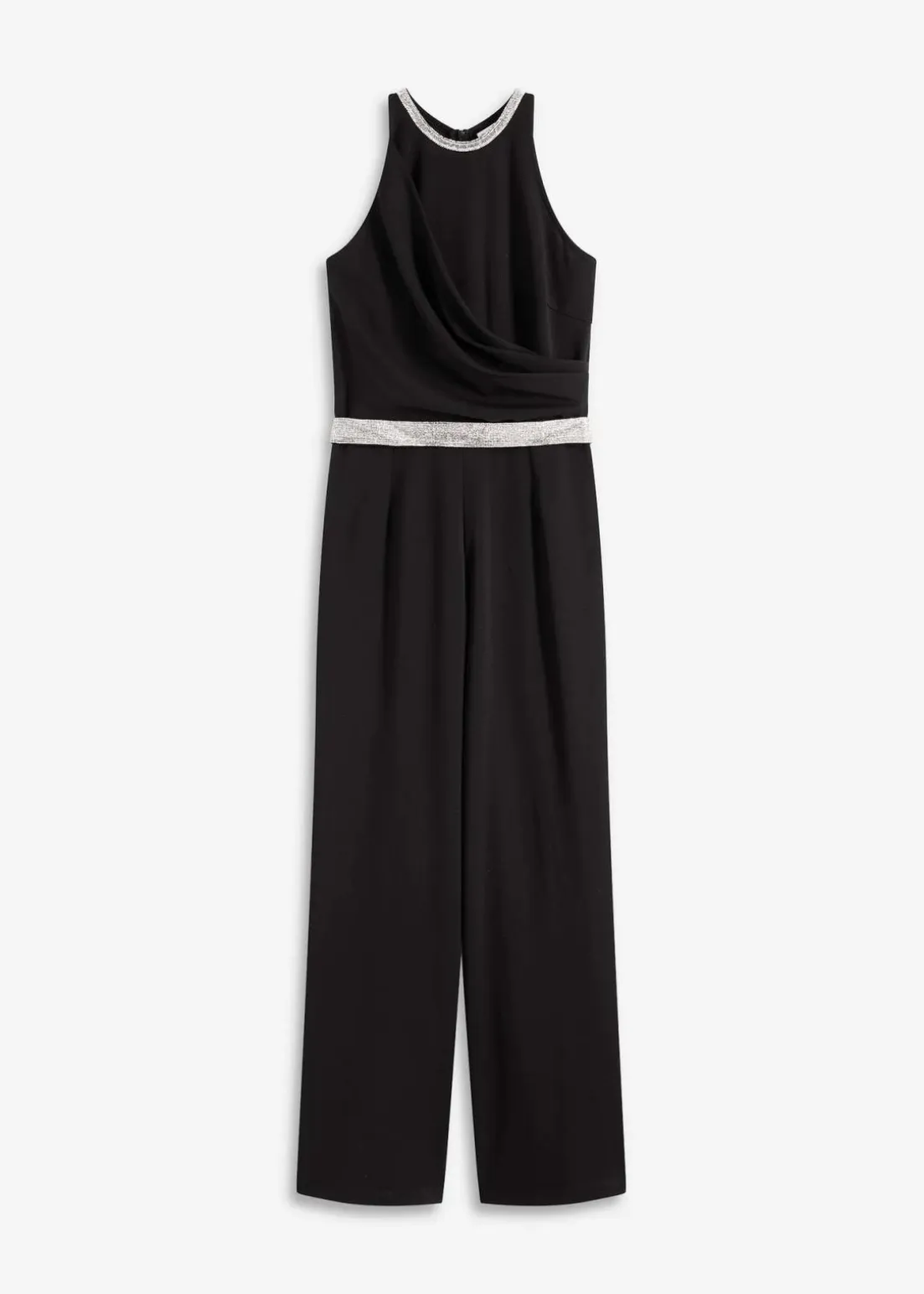 Modern und feminin: Overall aus strukturiertem Crepe mit Strassstein-Besatz am Ausschnitt und an der Taille