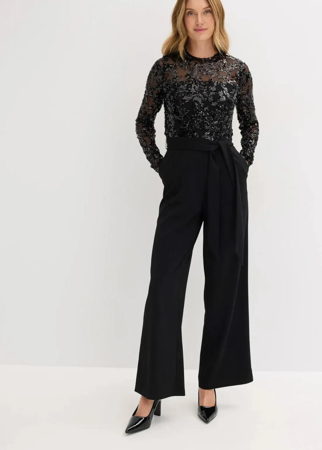 Modern und feminin: Overall mit Paillettenstickerei und Binde-Detail in der Taille