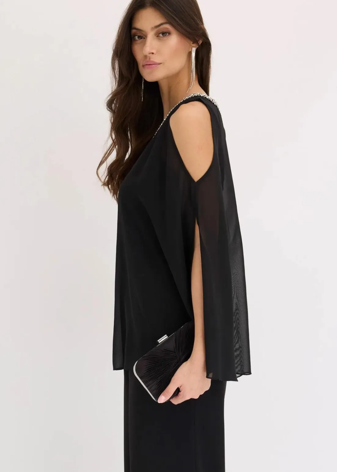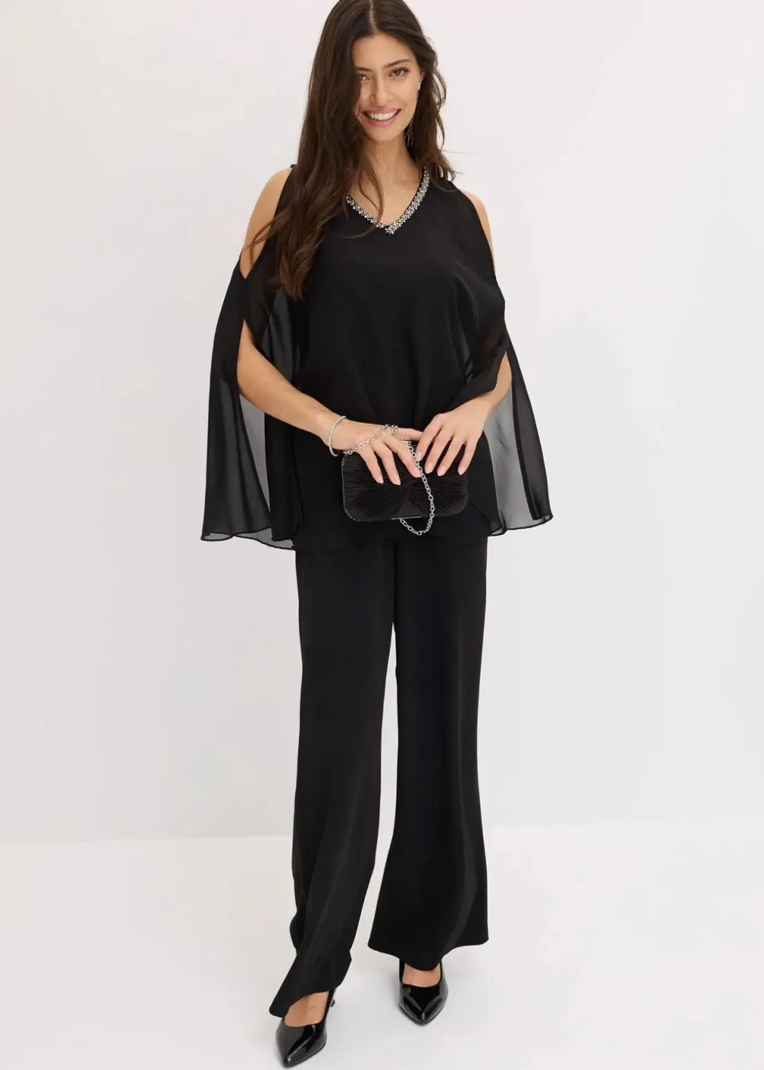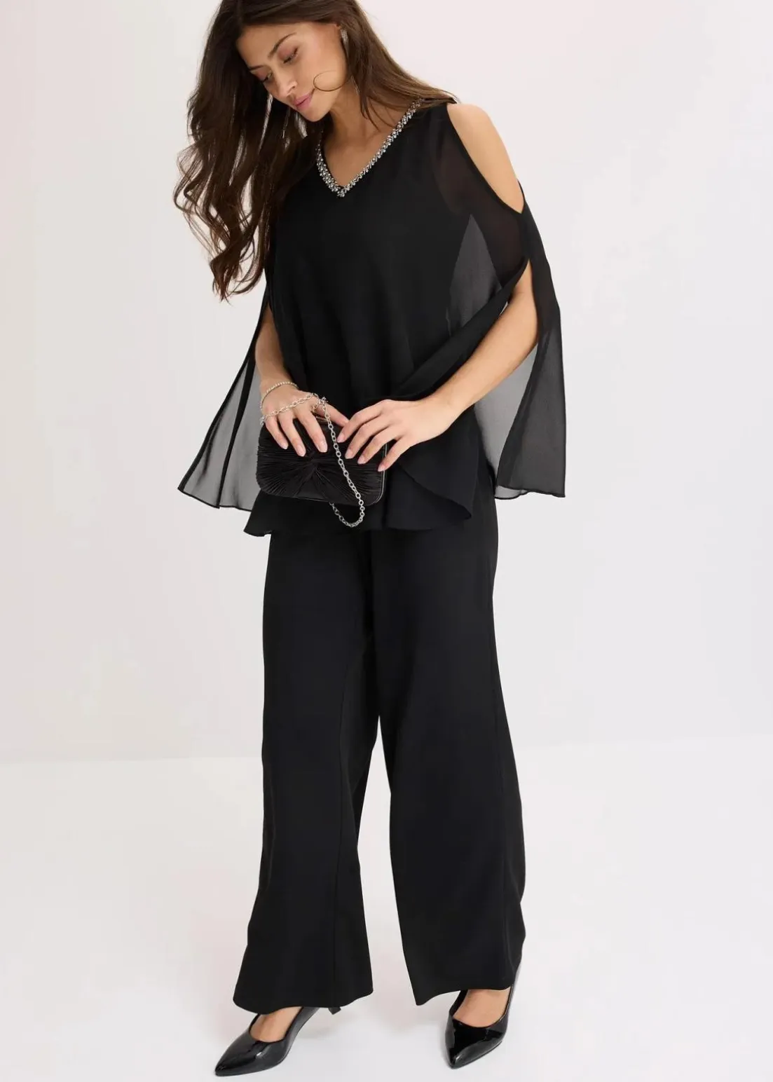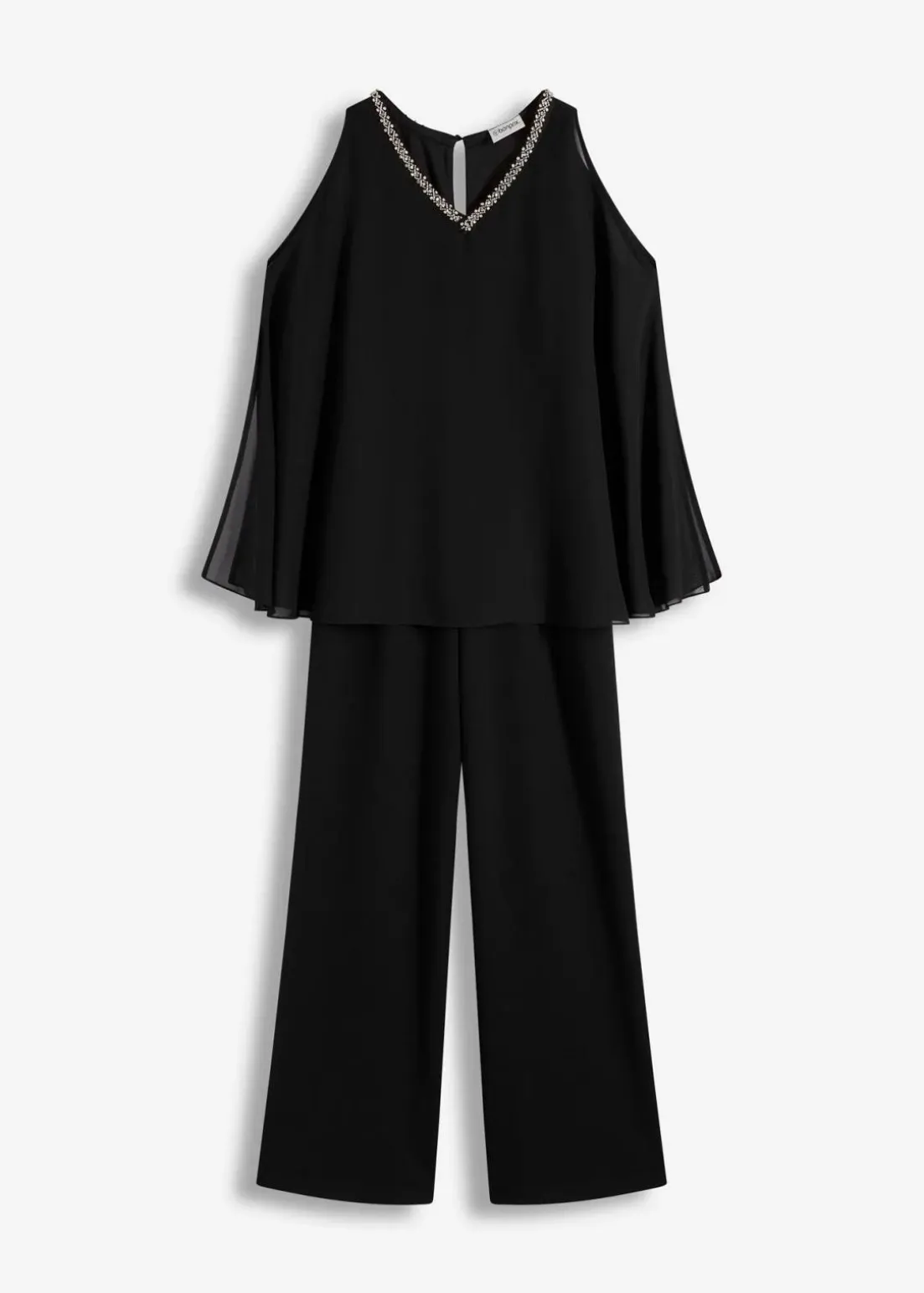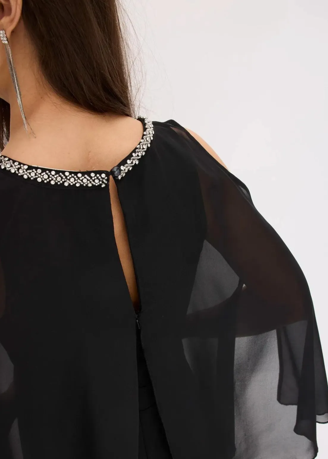 Modern und feminin: Overall aus strukturiertem Crepe mit kaschierendem Überwurf aus feinem Chiffon und Strasssteinverzierungen am Ausschnitt