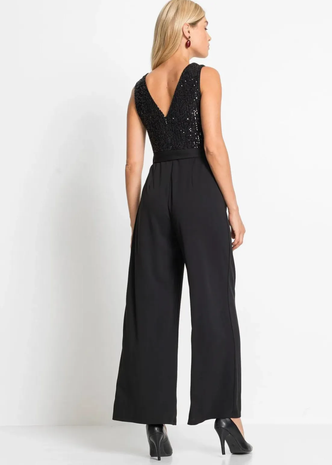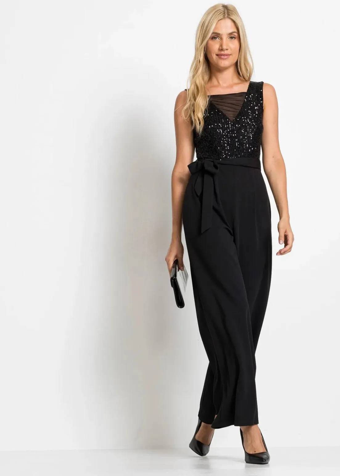 Feminin und Modern: Party-Overall mit Pailletten und Netz-Einsatz am Ausschnitt