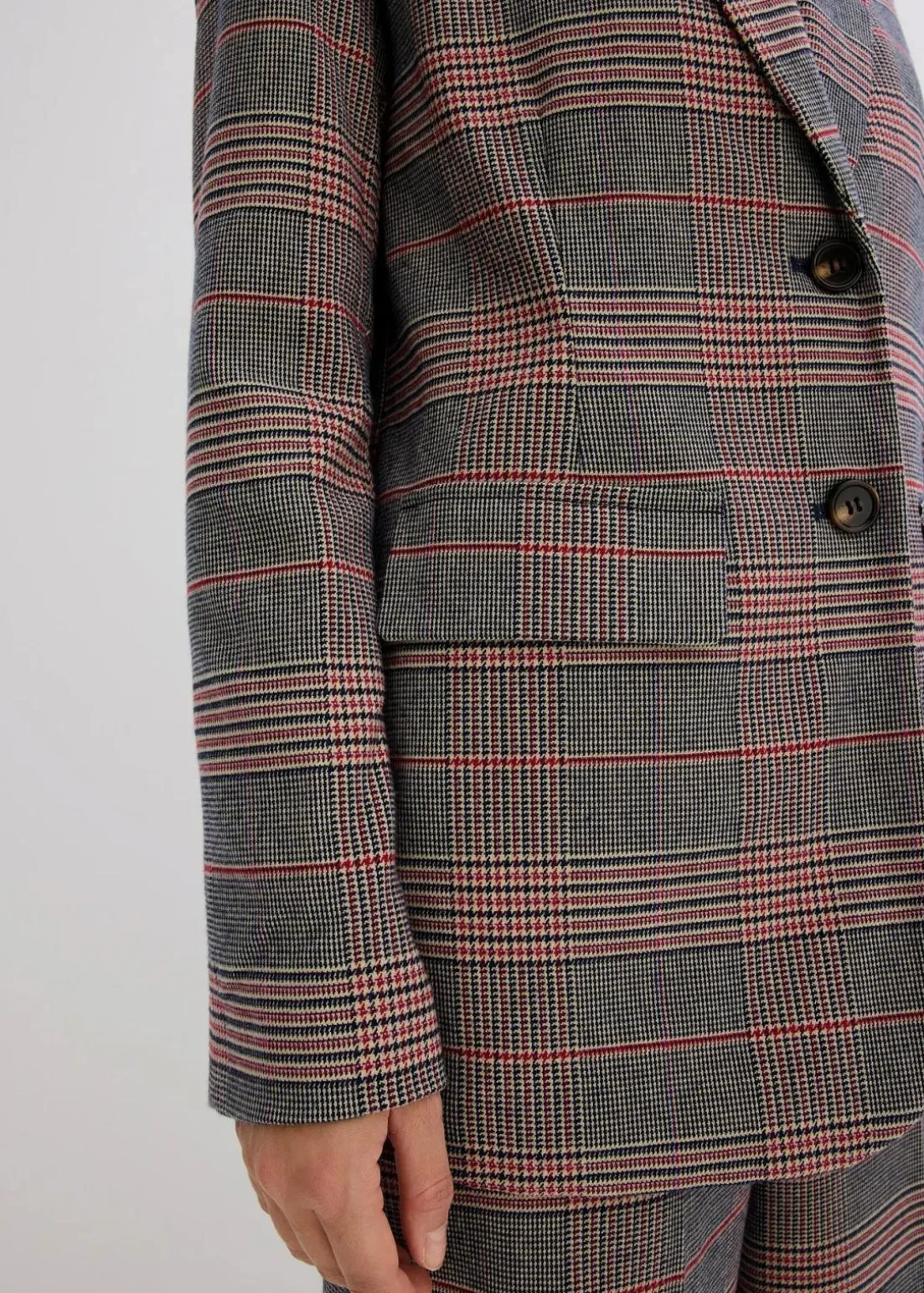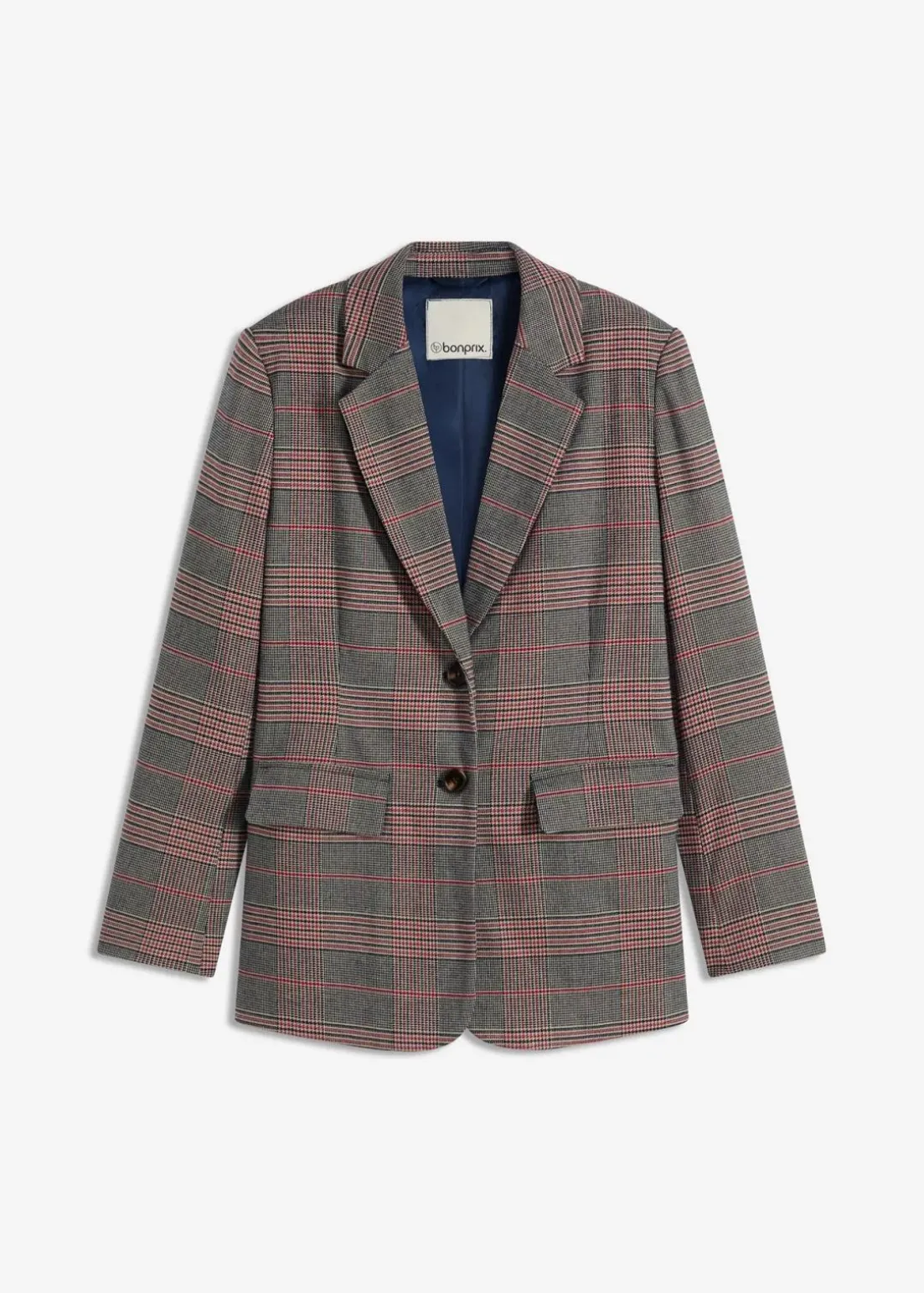 Einreihiger Blazer mit stark betonter Schulterpartie durch Schulterpolstern und Pattentaschen