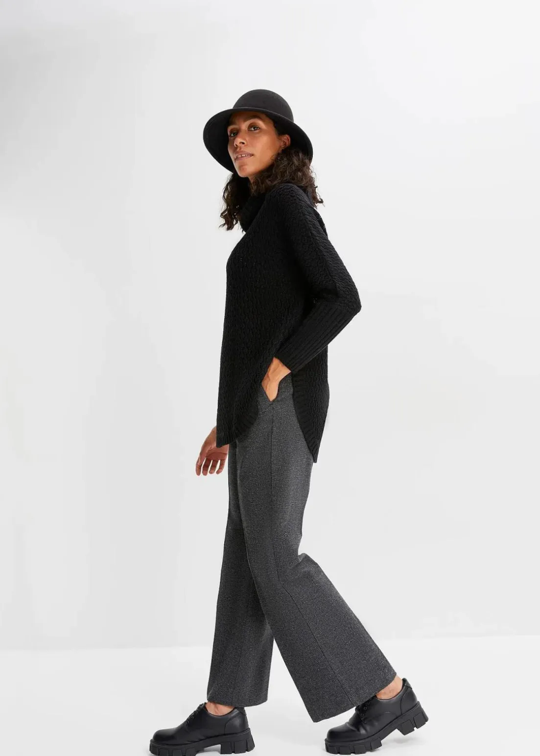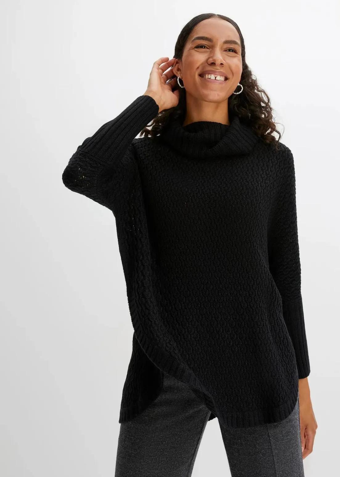 Modischer Oversize-Pullover mit Ajour-Muster, sowie einem großen Rollkragen und zwei seitlichen Schlitzen.