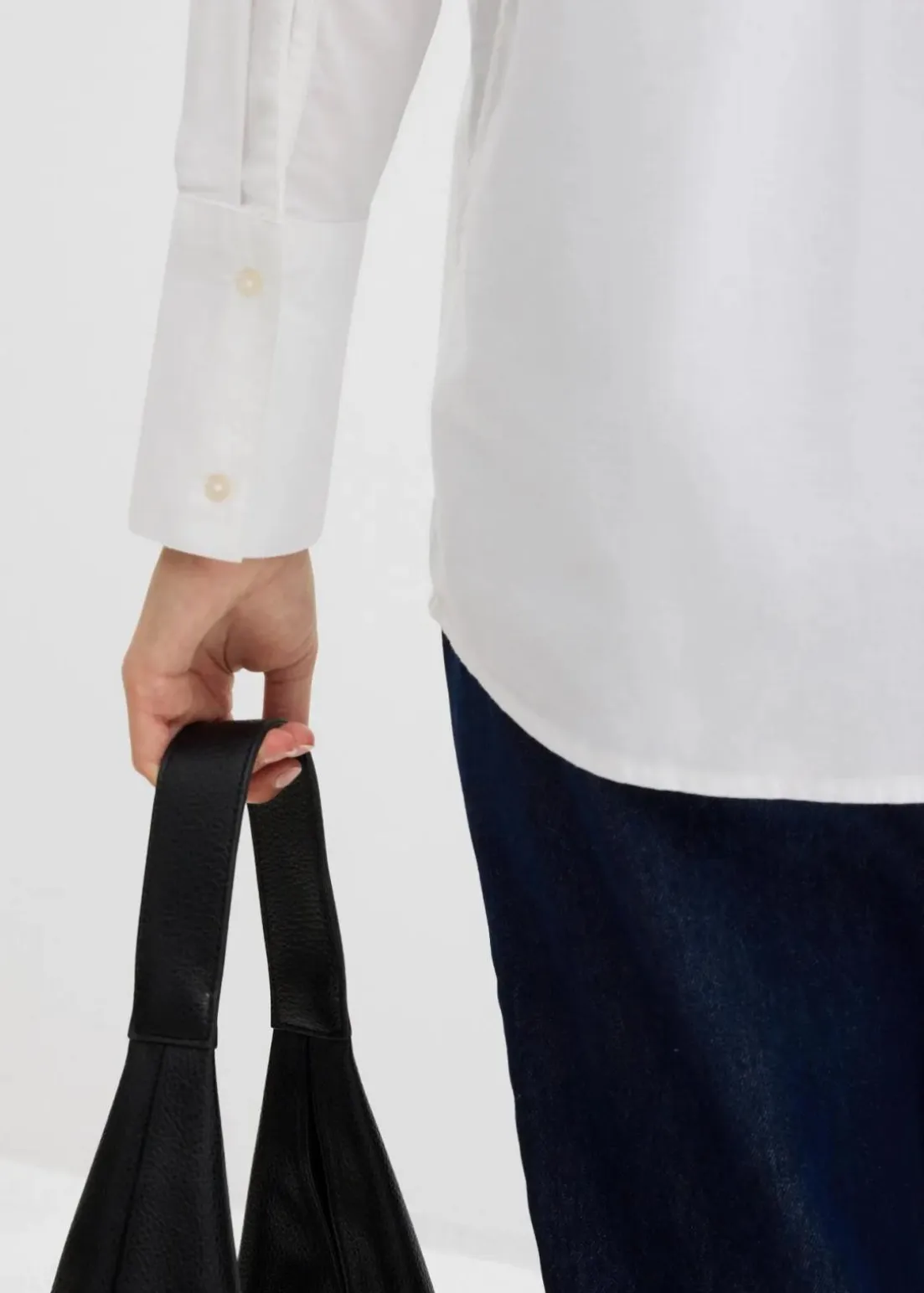 Oversized Bluse aus festem Bio-Baumwoll-Oxford mit Kragen, Knöpfen vorne und einer offenen Brusttasche. Lange Ärmel mit geknöpften langen Manschetten.