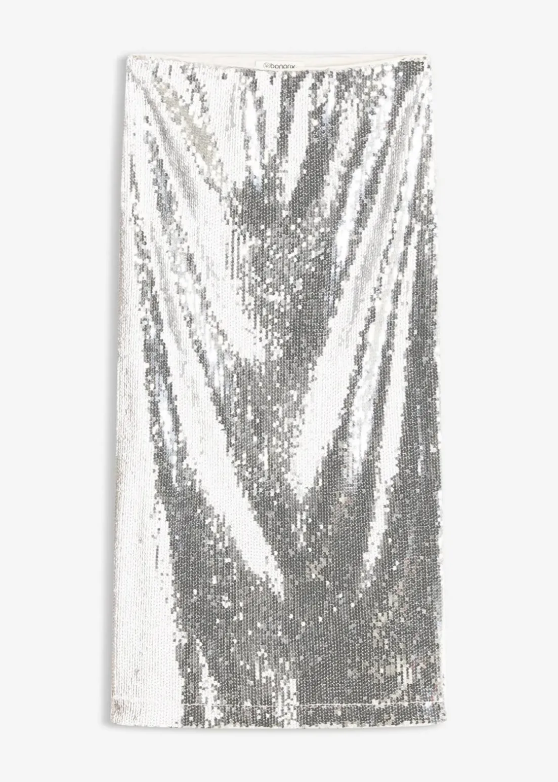 modischer Pailletten-Rock in Midilänge mit innenliegendem Gummibund und Schlitz hinten am Saum