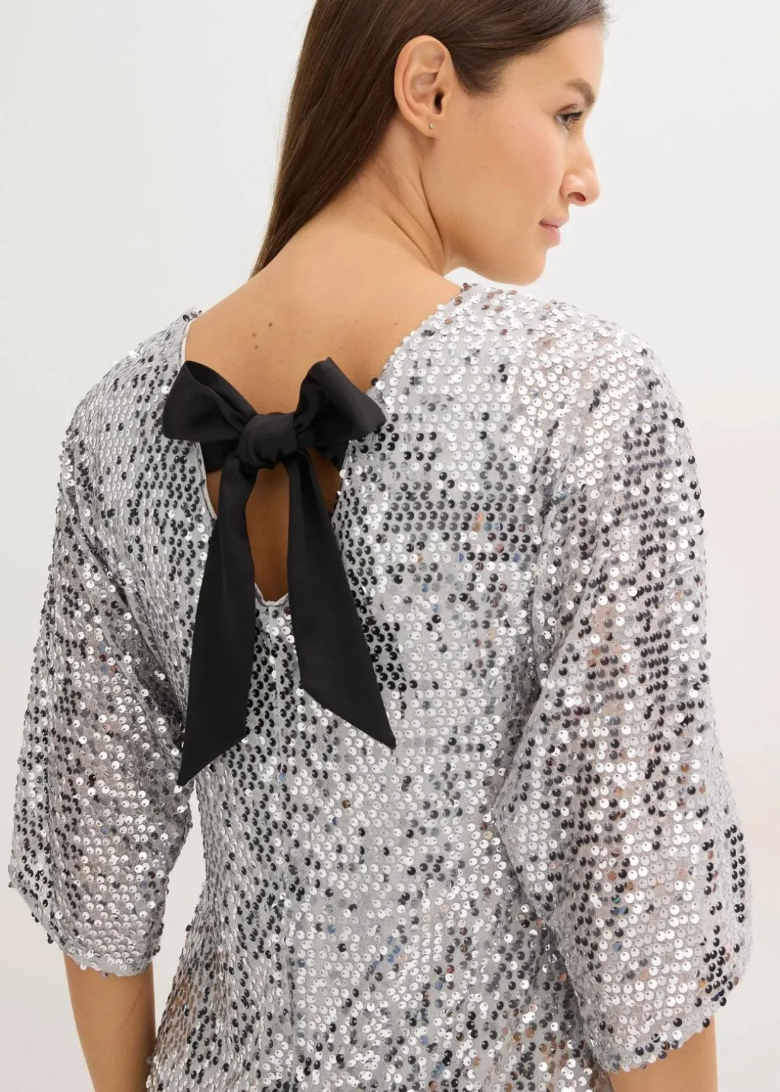 feminines Paillettenkleid mit tieferem Ausschnitt hinten und Schleifendetail am Rücken