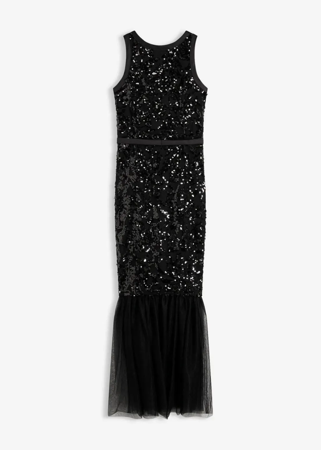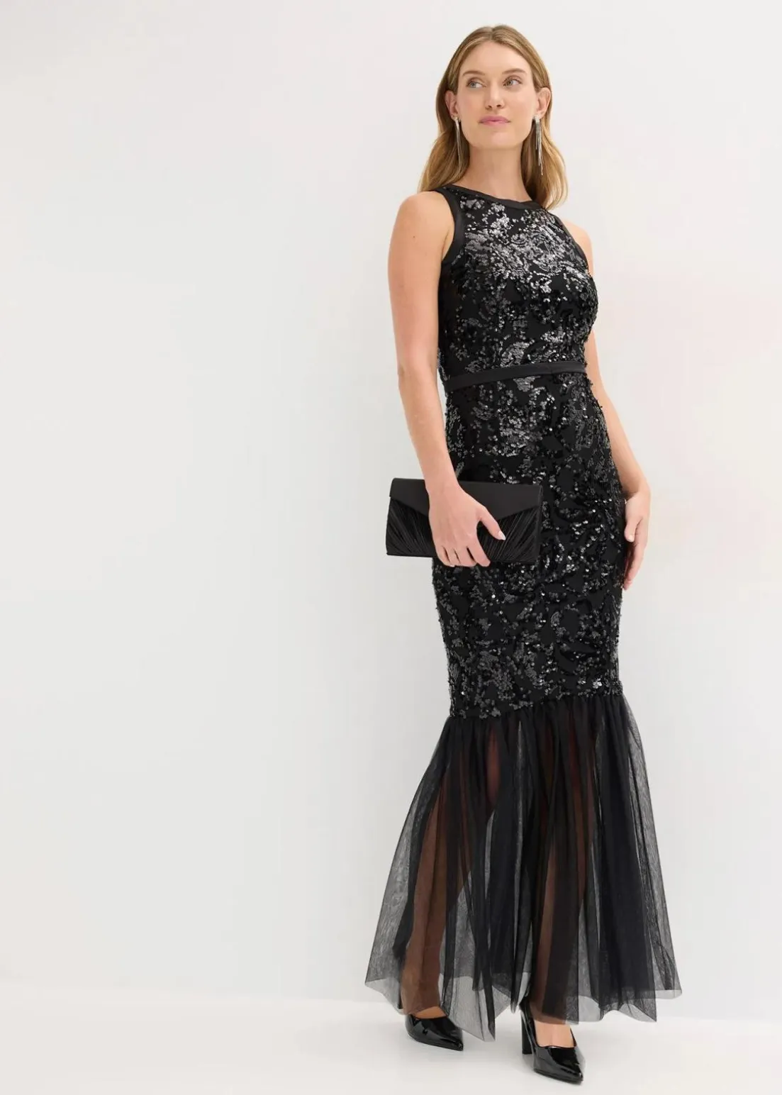 Modern und feminin: Bezauberndes Abendkleid in Mermaid-Shape mit Paillettenstickerei und einem Volants aus zartem Tüll