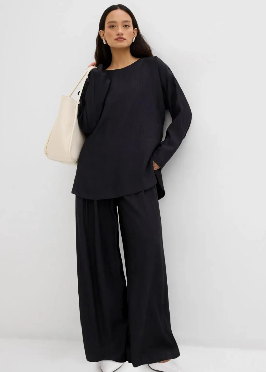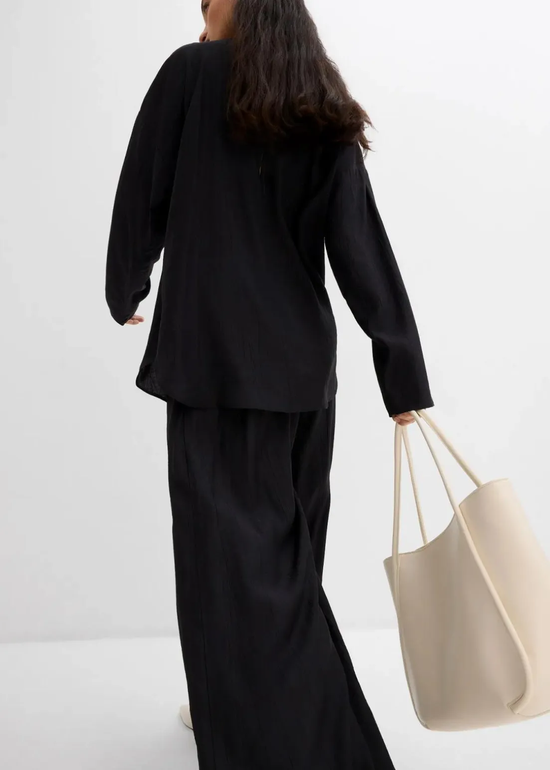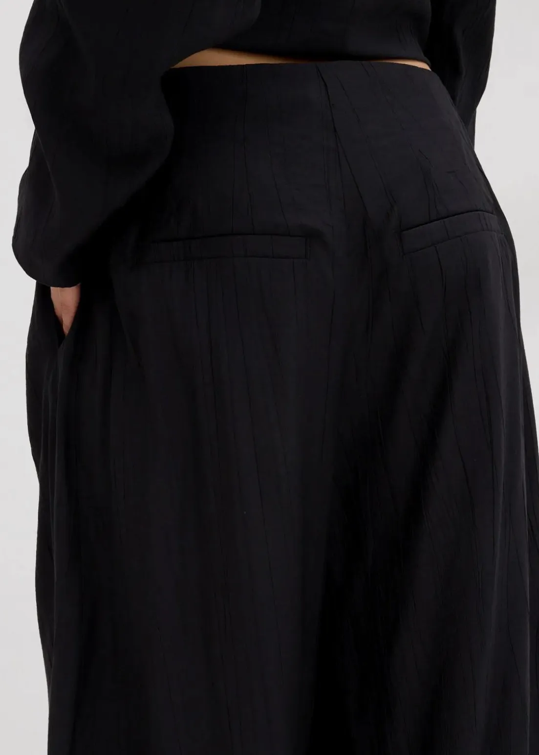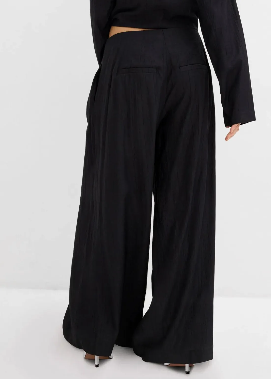 Palazzo-Hose mit zwei Seitentaschen vorne und zwei Paspeltaschen hinten sowie Abnähern an der Vorderseite.