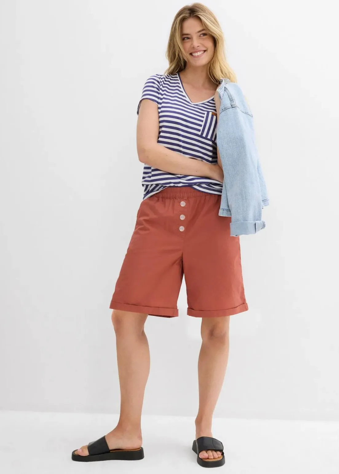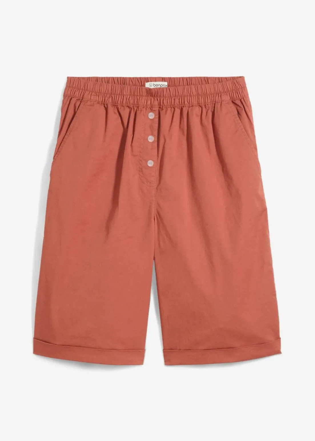 Bermuda mit hochgeschnittenem, elastischem Bund und seitlichen Eingriffstaschen.