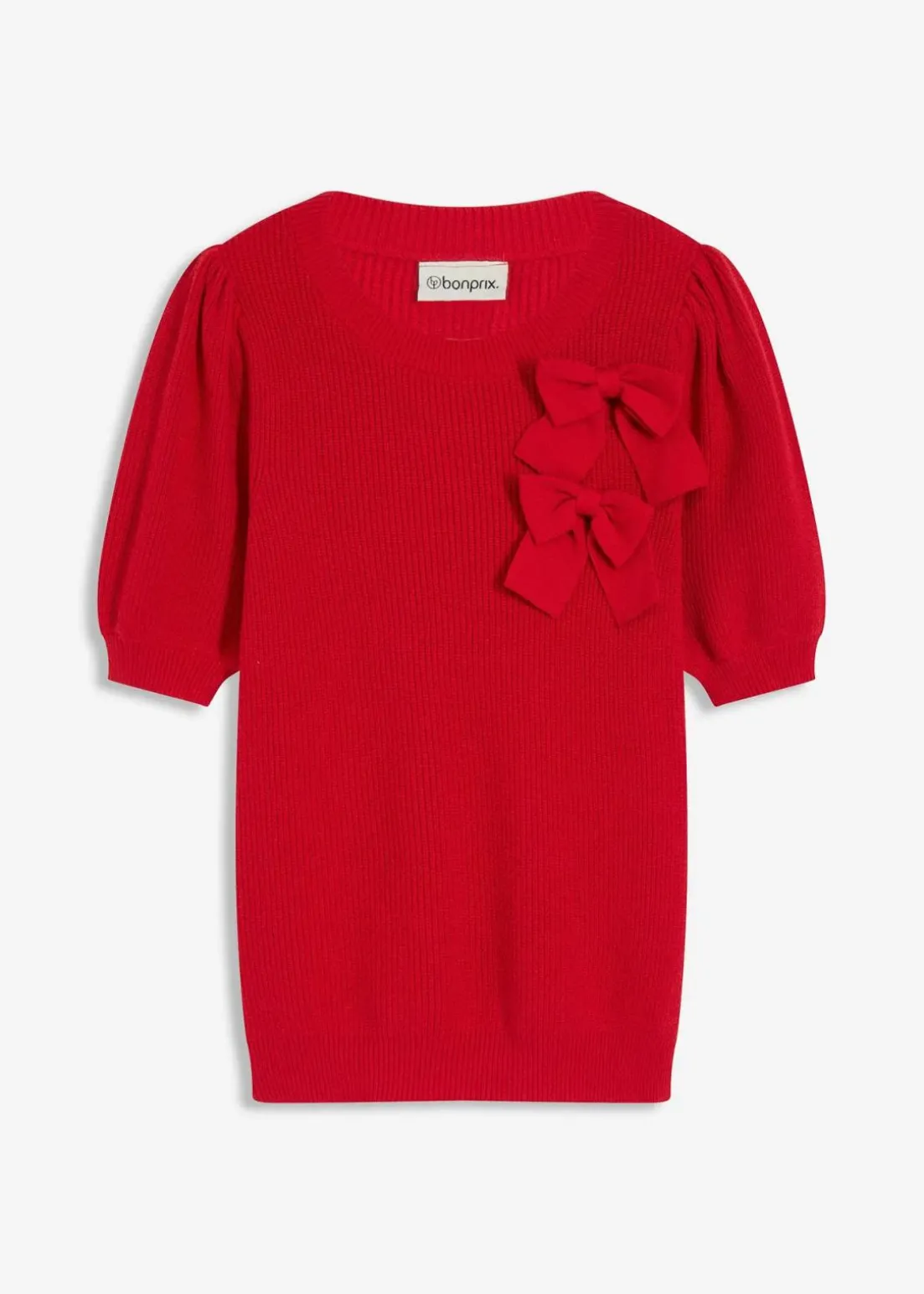 modischer Pullover mit Puffärmeln und dekorativer Schleifen-Applikation vorne