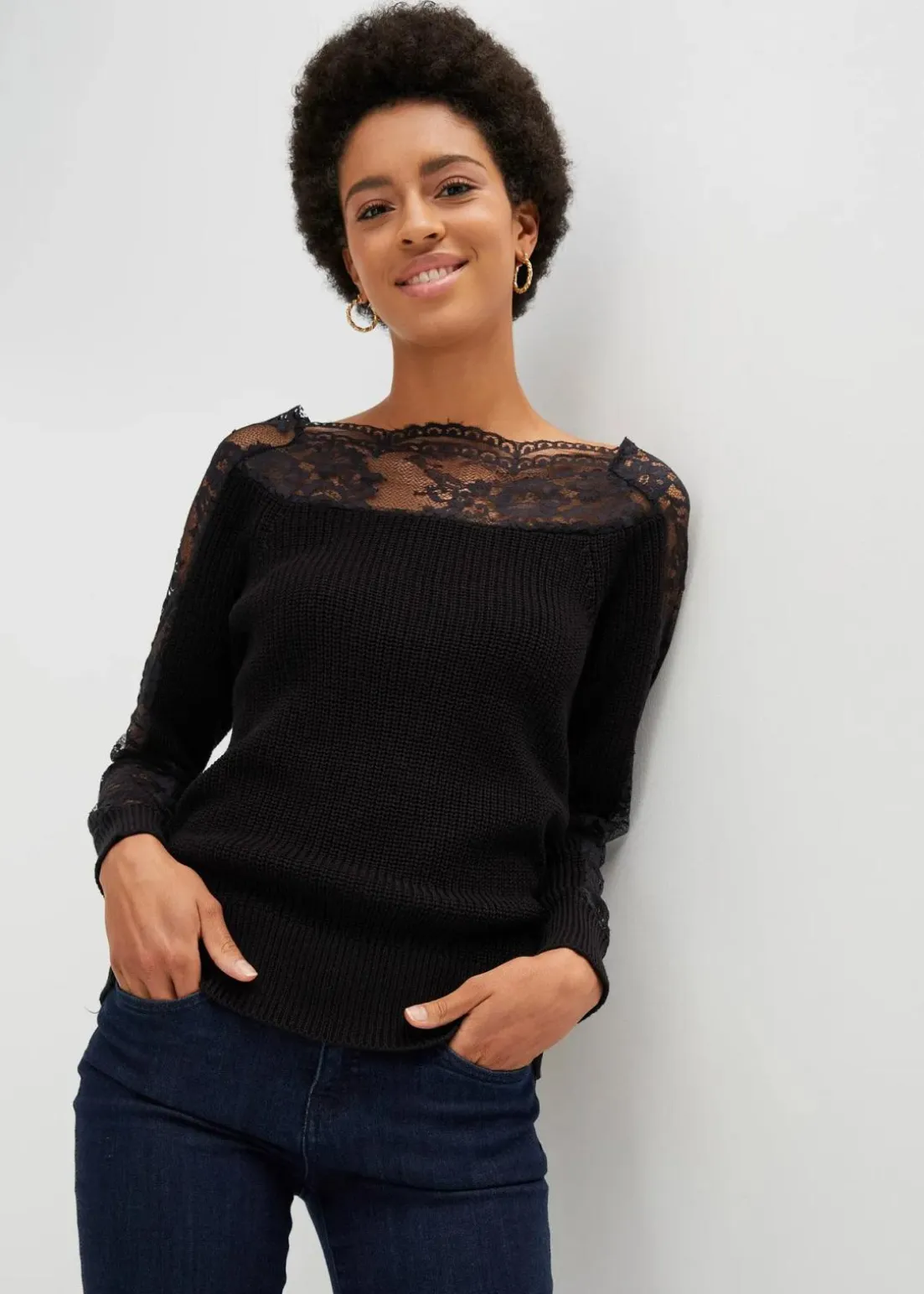 Dieser attraktive Pullover mit Spitzeneinsatz darf in keinem Kleiderschrank fehlen. Länge in Größe 36/38 ca. 64 cm.