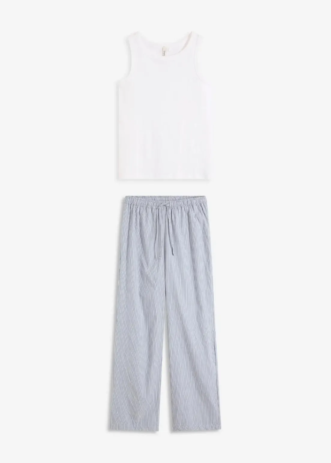Modischer Pyjama mit gerippten Tanktop und gewebter Hose mit Streifen und Bindeband