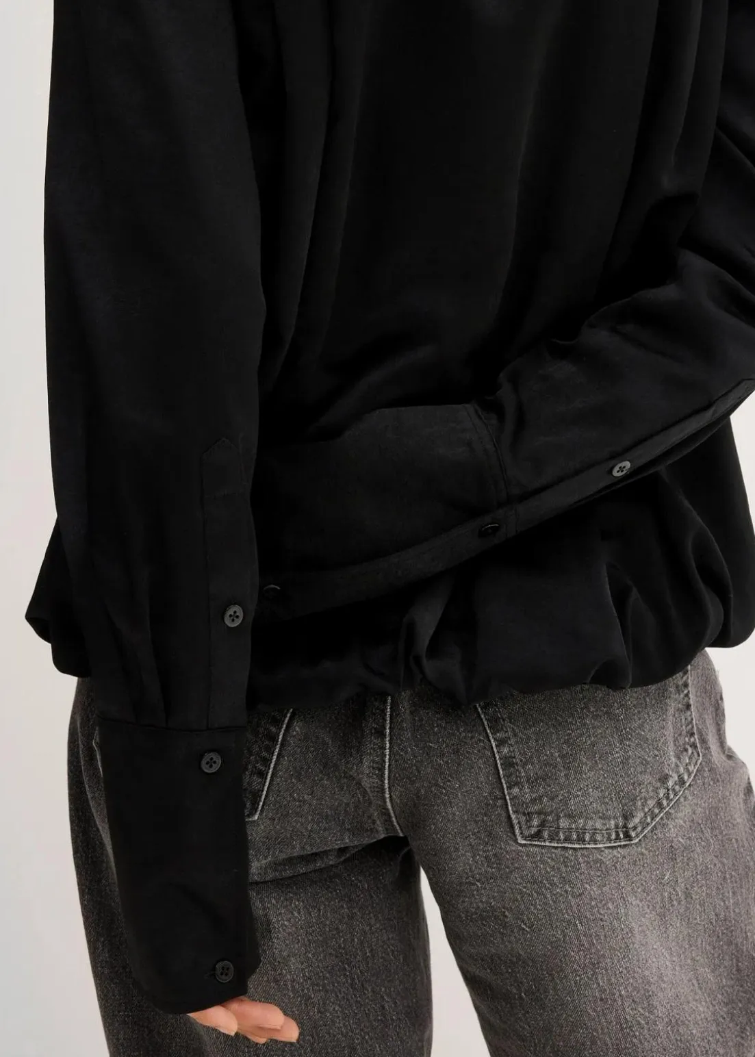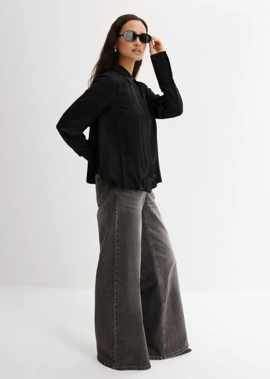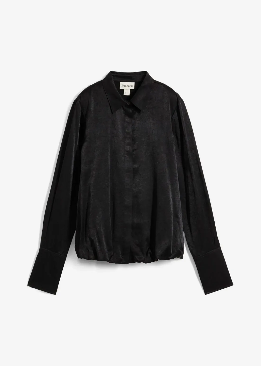 Langarmbluse mit verdeckter Knopfleiste und Ballonsaum. Der Ballonsaum ist geschlossen verarbeitet und kann nicht geöffnet werden.