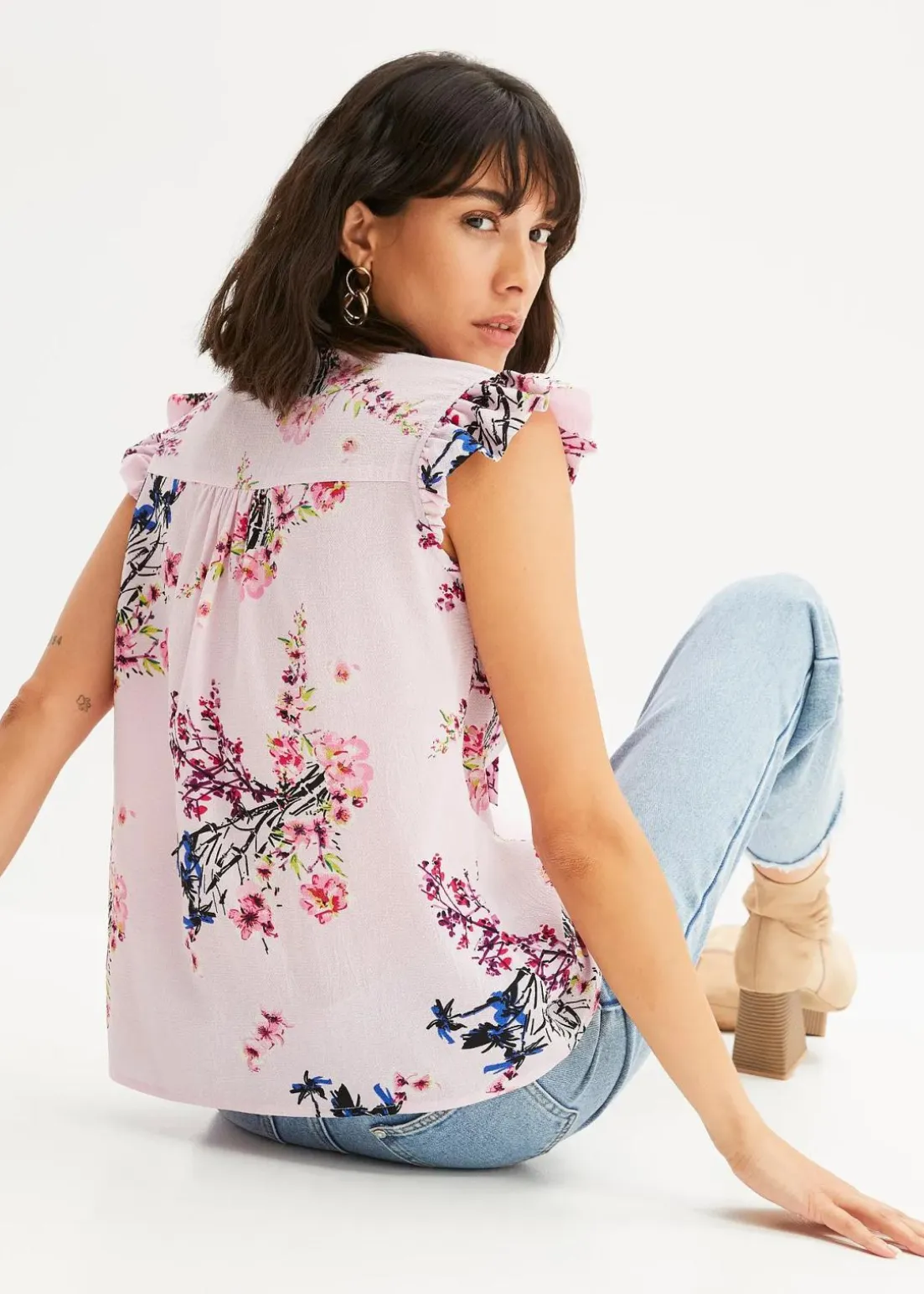 Luftig wie ein Top und elegant wie eine Bluse präsentiert sich dieses feminine Blusentop mit Schleife und Print von BODYFLIRT. Die schicke Schluppe am Ausschnitt ermöglicht ein Variieren des Designs, indem sie zu einer verspielten Schleife gebunden oder lässig geknotet wird. Eine romantische Note bringen die Volantrüschen ins Spiel, die die Armausschnitte säumen und Mini-Ärmel bilden.