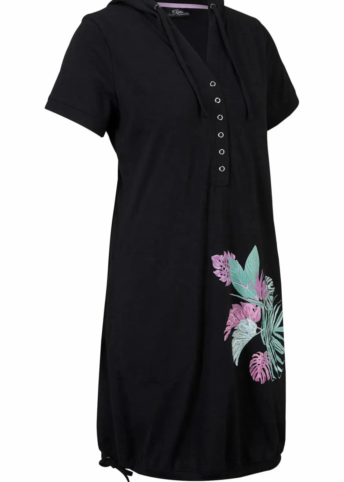 Shirtkleid mit Knopfleiste und Bindefunktion, floraler Print, seitliche Eingriffstaschen und Kapuze mit Tunnelzug