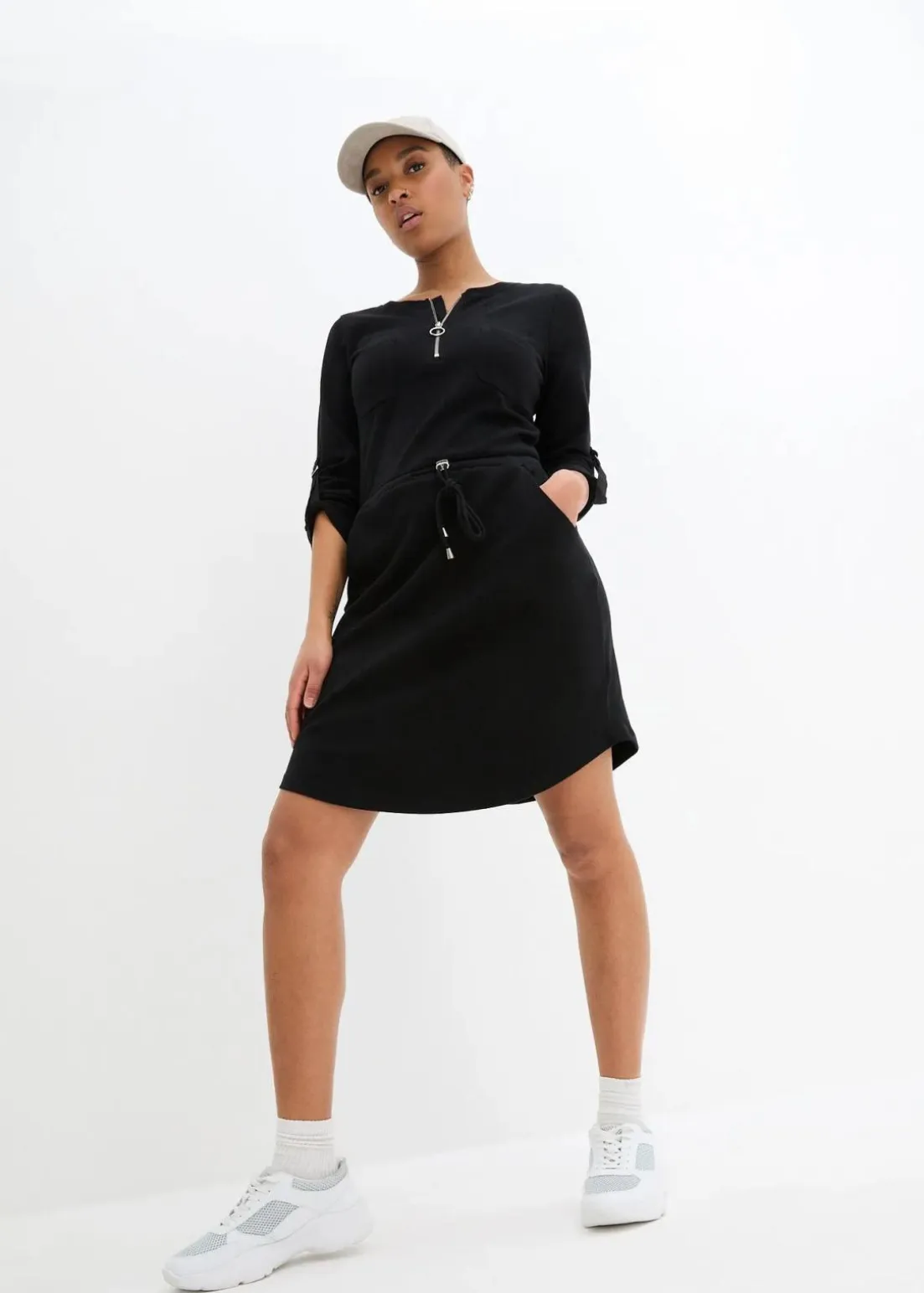 Taillenbetonendes Baumwoll-Shirtkleid mit verstellbarer Ärmellänge und Taschen