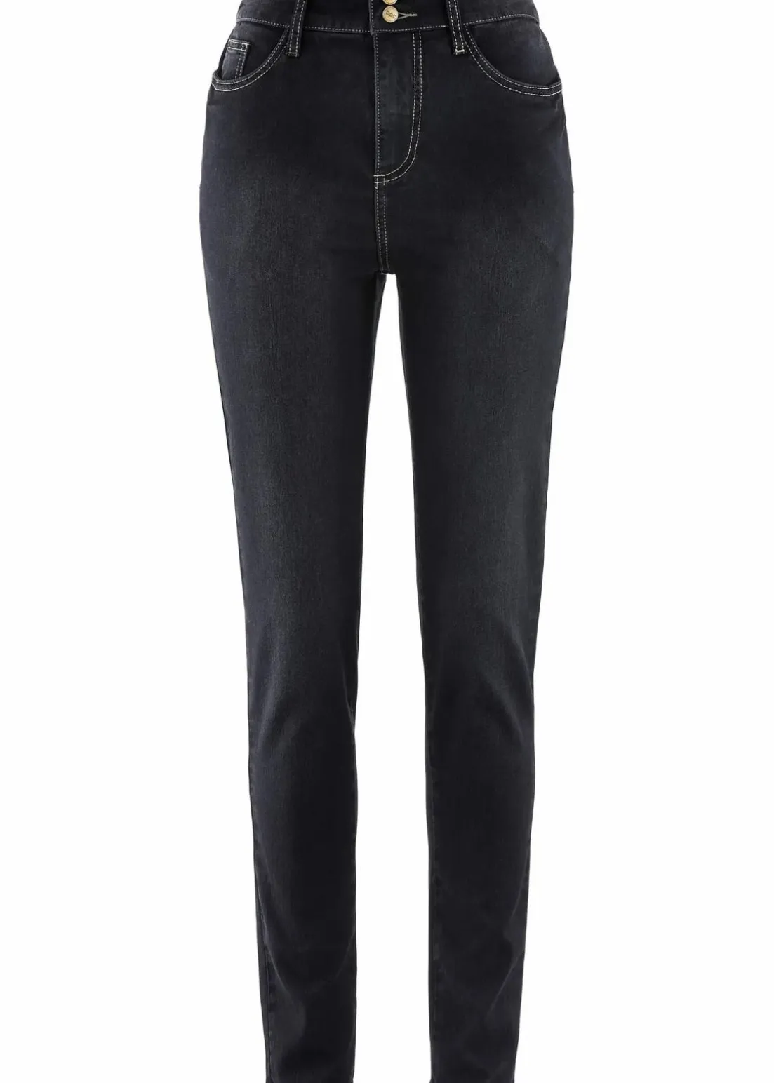 5-Pocket Jeans mit hohem Bund mit seitlichem Gummizug und zwei Knöpfen. Auf der Rückseite schräg verlaufenden Seitennähte für einen Push-Up-Effekt. Dünnes sehr elastischen Material.