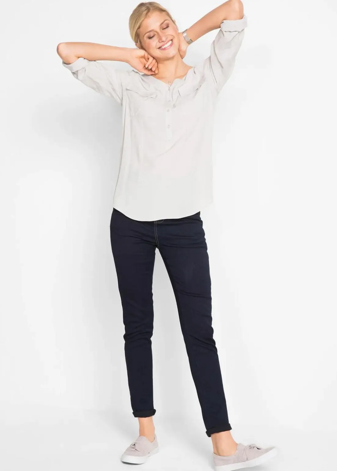 5-Pocket Jeans mit hohem Bund mit seitlichem Gummizug und zwei Knöpfen. Auf der Rückseite schräg verlaufenden Seitennähte für einen Push-Up-Effekt. Dünnes sehr elastischen Material.
