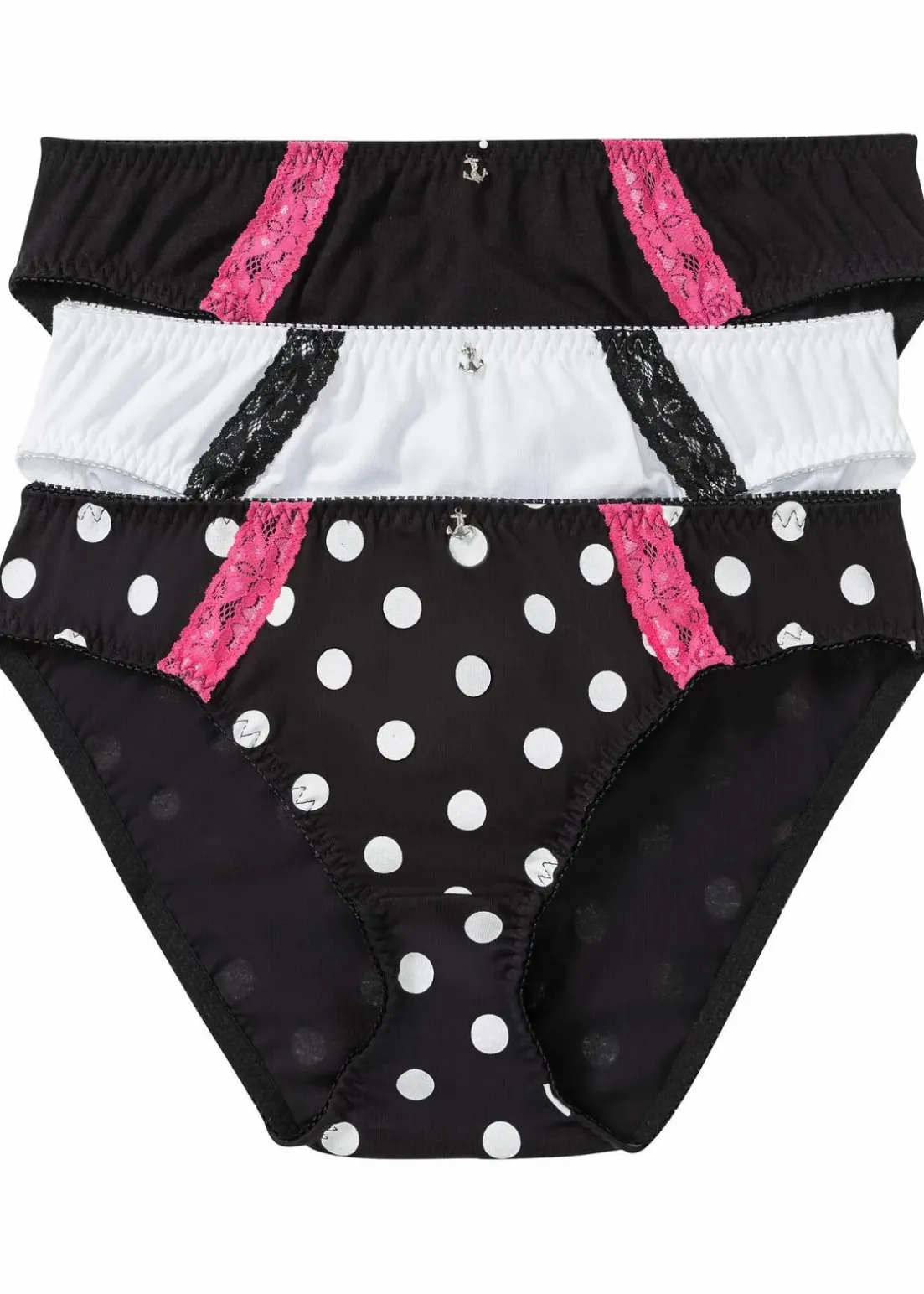 Der Slip aus der bpc Kollektion spielt wunderbar mit verschiedenen Farb- und Musterkombinationen. Mit diesem Multipack erhalten Sie je zwei verschiedene unifarbene Slips mit kontrastfarbigem Spitzenband sowie ein modisches Exemplar im Punktdesign aus hautfreundlicher Bio-Baumwolle.Ein schönes Anker-Accessoire schmückt die Slips. Elastische Nähte an Bund und Beinausschnitten sorgen für hohen Komfort und perfekten Sitz. Der Zwickel besteht aus Baumwolle.