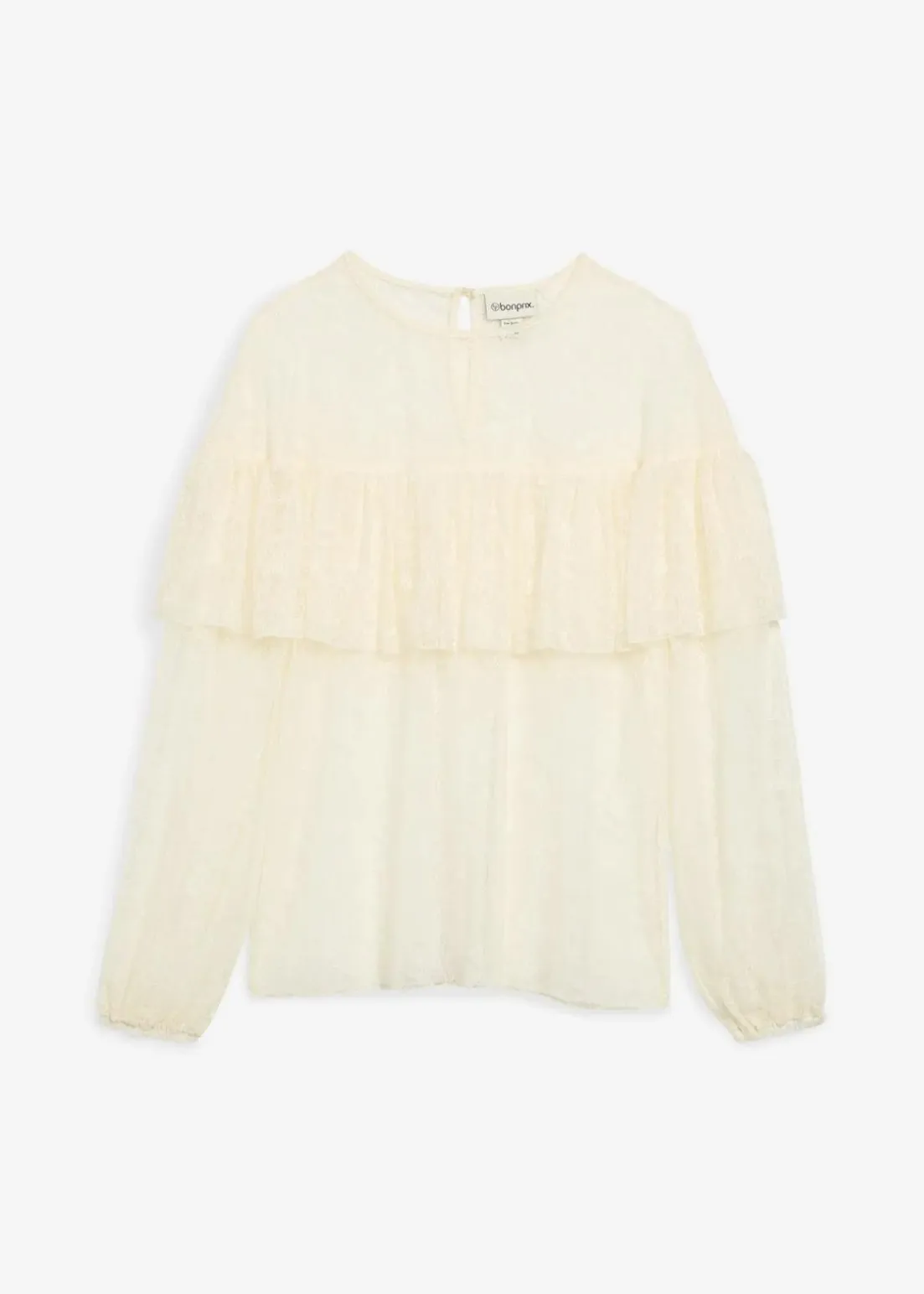 modische, ungefütterte Spitzenbluse mit Volant vorne und hinten und mit weit geschnittenen Ärmeln