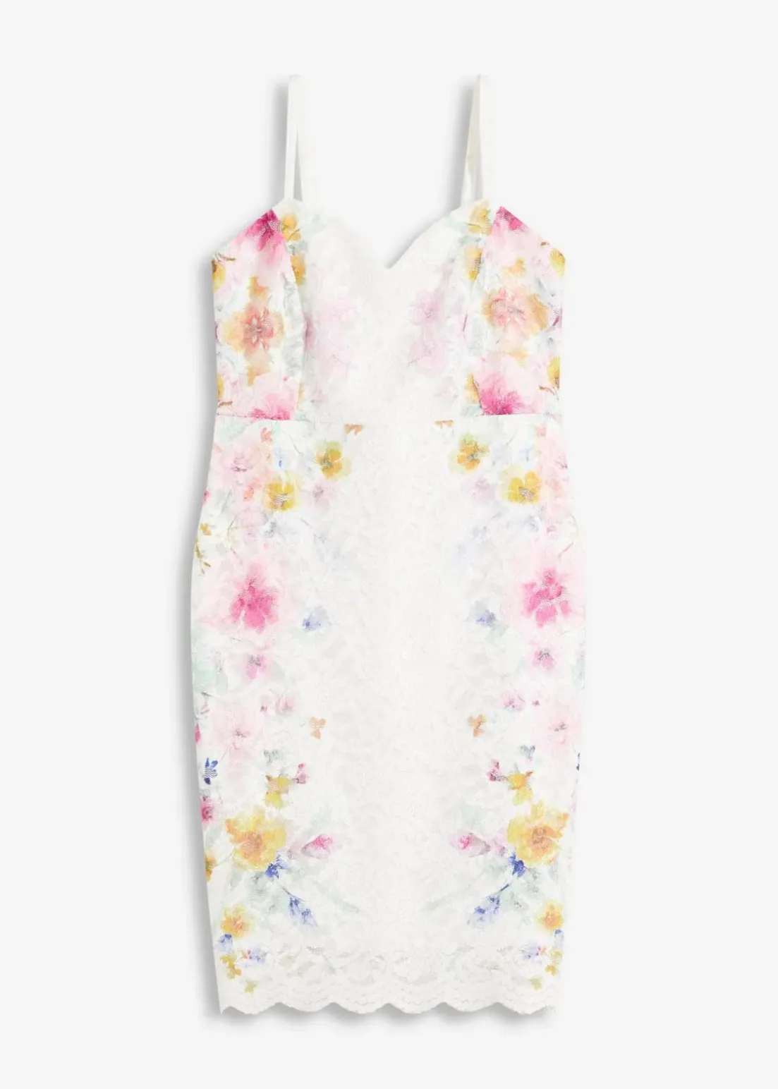 Modern und feminin: Spitzenkleid in Mini-Länge mit verstellbaren Trägern und floralem Print auf der Spitze