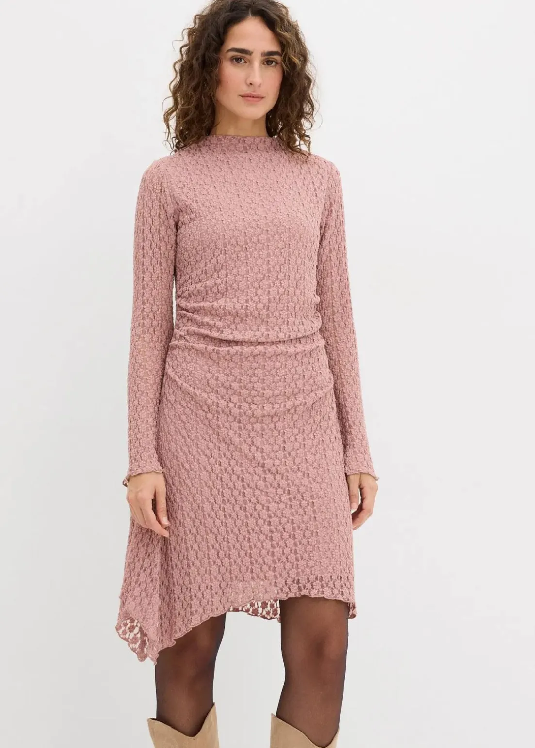 Figurbetontes Spitzenkleid mit Zipfelsaum und seitlicher Raffung
